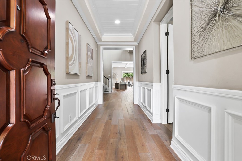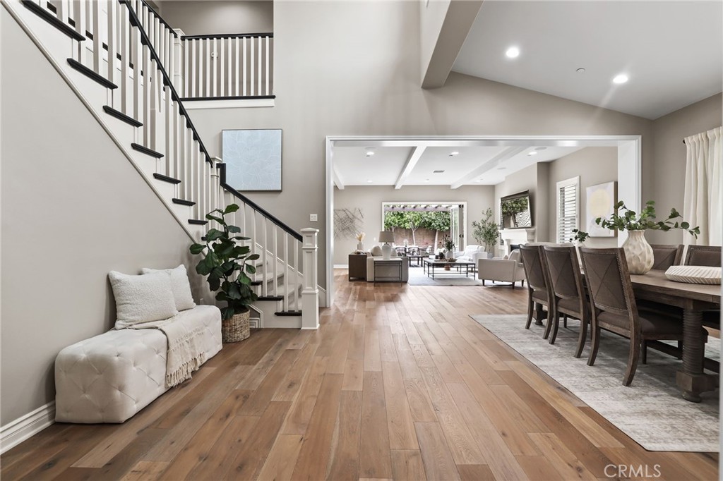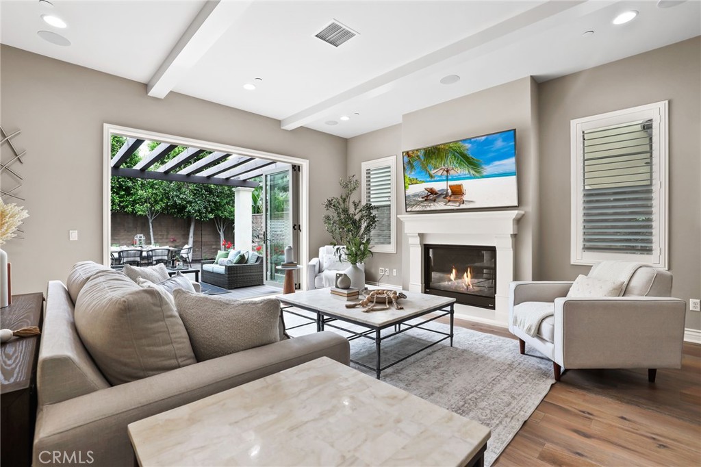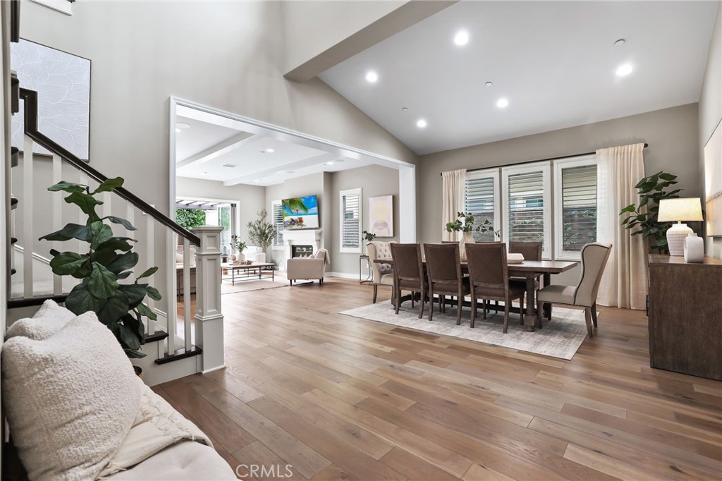Located in the prestigious guard-gated community of The Groves at Orchard Hills, this stunning Modern Mediterranean residence offers 4 ensuite bedrooms, including a highly desirable main-level guest suite, plus an upstairs loft across approximately 4,191 square feet of thoughtfully designed living space. Enter through the solid wood front door to rich hardwood flooring and an open-concept great room showcasing soaring ceilings and elegant wood beam details. The spacious family room flows seamlessly into the dining area and gourmet kitchen, appointed with upgraded cabinetry, quartz countertops, oversized center island accented by designer RH pendant lights, walk-in pantry, stainless steel appliances, and a separate prep kitchen that provides additional cabinetry, counter space, secondary sink, and enhanced functionality for entertaining, everyday cooking, or keeping the main kitchen beautifully organized. The downstairs guest bedroom with private ensuite bath is ideal for multigenerational living, overnight guests, or a private home office. Upstairs, a generous loft provides flexible living space ideal for a media room, office, or play area. The luxurious primary suite features a spa-inspired bath and dual walk-in closets with custom built-in shelving. Two additional secondary bedrooms are generously sized, each with their own private full baths. Designed for exceptional indoor-outdoor living, the backyard offers a spacious covered patio with pergola, perfect for entertaining or everyday relaxation, with stylish seating and dining areas framed by mature landscaping for enhanced privacy. Additional highlights include energy-efficient solar panels, water softening system, epoxy-coated garage floors, and built-in garage cabinetry providing excellent storage and organization. Residents enjoy resort-style Orchard Hills amenities including pools, spas, clubhouse, tennis and basketball courts, tot lot, picnic areas, and scenic greenbelts. Ideally located within walking distance to top-ranked elementary & middle schools and shopping centers.