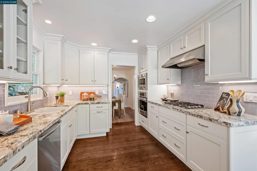Delightful! Orinda Country Club charmer on a peaceful hilltop lane. Single story, low maintenance. Updated kitchen and baths, hardwood floors, recessed lights, and al fresco dining in the gardens. Just a 2-minute drive to the freeway, and 10 minutes from the fun of Lafayette, but a million miles away from it all. Updated kitchen and baths were design-firm done for the owners, no skimping. Come home to your own front porch, lawn and azaleas, with neighbors out walking the dog. Step inside to classic warmth with flow for entertaining indoors and out; spacious primary suite with luxe bathroom; additional space to spread out with a family room, a she-shed, and five charming outdoor retreats.