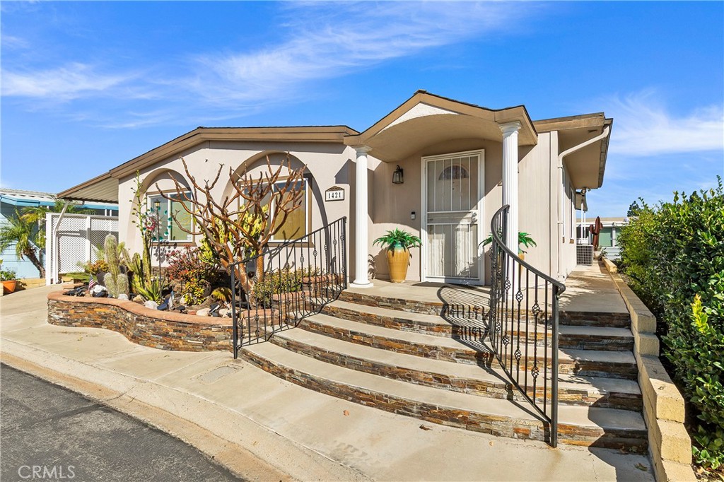 This is a golden opportunity to own one of the most desirable homes in one of Corona’s most convenient senior communities—and yes, you own the land. That’s right. This beautifully maintained, larger triple-wide manufactured home on private land lives and feels like a traditional single-family residence, with space, flow, and thoughtful design throughout. Inside, the living room creates its own inviting vibe with a custom-built entertainment center, opening seamlessly to the formal dining area. Here, charming depression-glass–style window adds character and warmth—perfect for hosting memorable gatherings. The kitchen is a true showstopper, designed for hosting and gathering. A long granite island, abundant cabinetry, and granite countertops create both beauty and function. There’s even a cozy lounge-style seating area, making this the heart of the home where conversations linger and guests feel right at home. The spacious primary suite is a private retreat, featuring its own side deck—ideal for quiet morning coffee or peaceful yoga moments. The ensuite bathroom offers double sinks, a large soaking tub, and a walk-in shower with a safety handle, thoughtfully designed for comfort and ease. With three bedrooms and two bathrooms, there’s plenty of room for guests or hobbies. The second bathroom is a convenient bathroom, shared between a bedroom and the laundry area—perfect for visitors. An additional side space is currently used as an office but can easily flex as storage or a creative nook. The third bedroom is ideal for overnight company or a hobby room. Outside, you’ll find extra exterior storage and a covered carport for two vehicles, adding to the home’s practicality and ease. Located in the sought-after Village Grove Community, residents enjoy secure fob access, a sparkling pool and spa, clubhouse, recreation room, and gym/exercise room-everything you need for an active and social lifestyle. This isn’t just a home-it’s a lifestyle, a sense of ease, and a place where ownership truly matters. Come tour this special property and experience it for yourself!