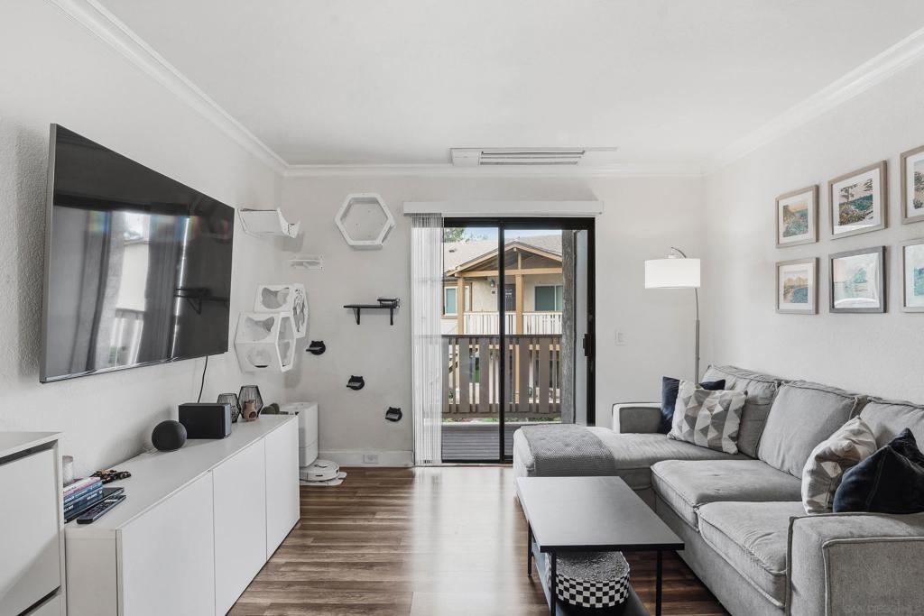 Don’t miss this opportunity to take over a beautiful top floor condo with a VA assumable loan in a quiet gated community. Offering 2 bedrooms, 1 bath, and just under 800 sq ft of bright and inviting living space, this home blends comfort and style with modern finishes from a recent renovation, in unit laundry, and a fully permitted AC system, one of only a few homes here with full air conditioning. Step onto your private balcony overlooking a peaceful green courtyard and enjoy the sense of calm throughout. The community offers resort style amenities including a pool, spa, fitness center, BBQ area, and two assigned parking spaces. Conveniently located just minutes from Target, Costco, and easy access to I-8 and 67. Call today to schedule your private tour, this one will not last.