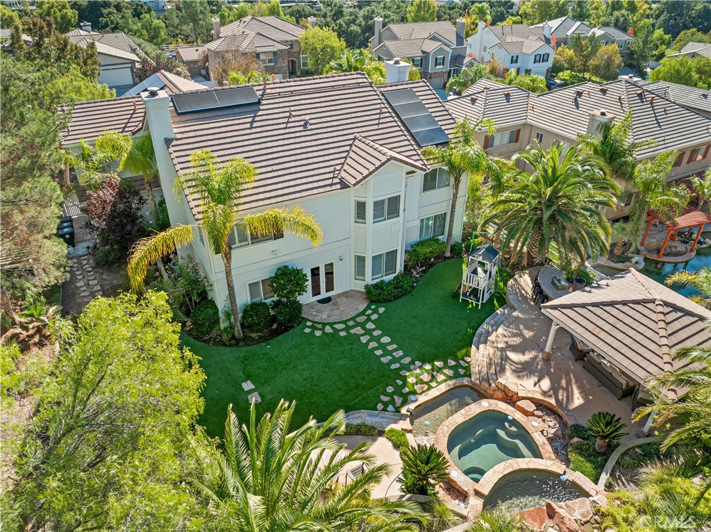 Exquisite Fully Remodeled 5 Bedroom, 3 Bath Sand Canyon Home with Over 4,000 Sqft, Primary with Retreat, Massive Bonus Room, Downstairs Bedroom, Office, and Full Bath, Owned Solar, Solar Back up Battery, 3 Car Garage with a Tropical Oasis Yard on a Cul-De-Sac! Step through the double-door entry into a grand living room featuring a captivating fireplace that opens to the elegant dining area. Interior highlights include crown molding, stunning chandeliers and designer light fixtures throughout, new flooring, new HVAC, new water heater, and shutters. Enjoy a large gourmet eat-in kitchen complete with a Wolf stove and microwave, Cove dishwasher, Sub-Zero refrigerator, expansive center island, farm sink, and a cozy breakfast nook. The kitchen opens to the inviting family room with a beautiful fireplace, custom hearth and mantel, built-in entertainment center, and French doors that lead to the tropical oasis yard. Adjacent to the family room is a built-in bar area with a wine refrigerator, perfect for entertaining. The main floor offers two bedrooms, a full bath, and a laundry room with storage cabinets and a utility sink. Upstairs, find a built-in desk area and bookcases off the landing. The double-door entry primary retreat showcases a fireplace, a large bonus room, and a spa-like ensuite with dual sinks and vanity area, a cast iron custom jet tub, and a glass-enclosed walk-in shower. Two additional bedrooms share a Jack-and-Jill bathroom with dual sinks, and there’s also a massive bonus room with built-in storage and a balcony offering stunning views. Step outside to your private tropical paradise featuring a built-in cooking station with a large bartop and plenty of seating, a huge gazebo, a tranquil waterfall flowing into the spa (with new safety gate and heater), and a large sunken firepit area perfect for gatherings. Located near Sand Canyon Golf Course, new shopping centers, and with easy freeway access — this home truly has it all! Don’t miss your opportunity to make this your New Home!