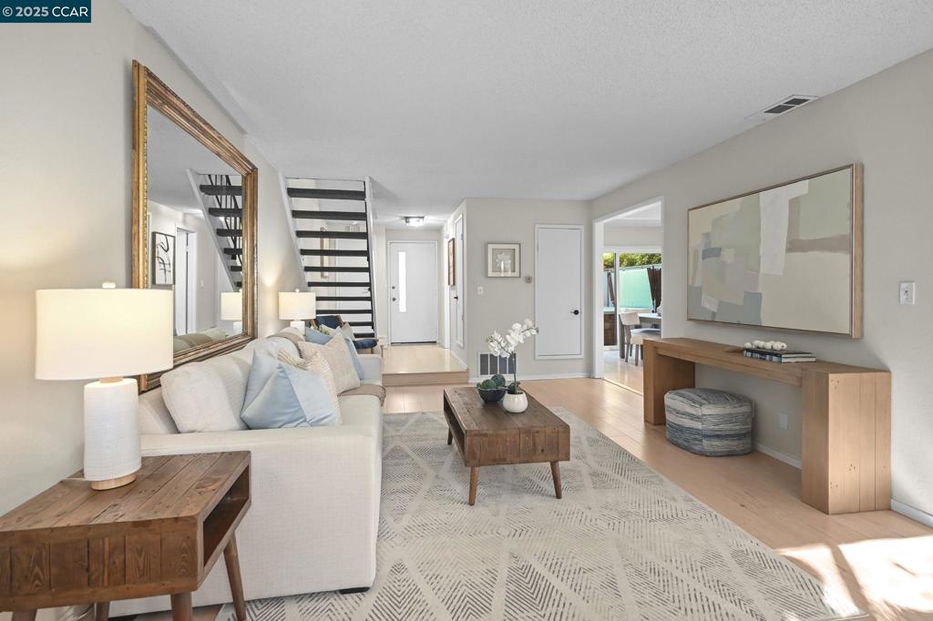 Opportunity knocks! Your dream home awaits!! Light and bright end-unit in a serene Tahoe-like setting with stunning treetop views. Spacious, open floor plan is ideal for hosting upcoming holiday gatherings. Enjoy the cozy fireplace in the living room or gather in the dining room to share a memorable meal. The kitchen features fresh white cabinets, Corian counters and sleek black appliances with easy access to the courtyard patio, perfect for grilling, dining, or relaxing in the bubbling hot tub. Three upstairs bedrooms share a pass-through bathroom and include a primary suite with separate vanity, multiple closets, and private deck overlooking the tranquil natural setting—ideal for morning coffee. Attention to detail and stylish updates include gorgeous wood flooring, and chic lighting for a modern touch. Indoor laundry and half bath on the lower level. Abundant storage throughout. New roof and gutters, replaced in 2025. Community pool and tennis courts. Conveniently located in the sought-after Vine Hill area on the Pleasant Hill/Martinez border, with easy access to great schools, shopping, transportation, parks, hiking trails, downtown Martinez, and the best the East Bay. This beautiful townhome checks all the boxes!