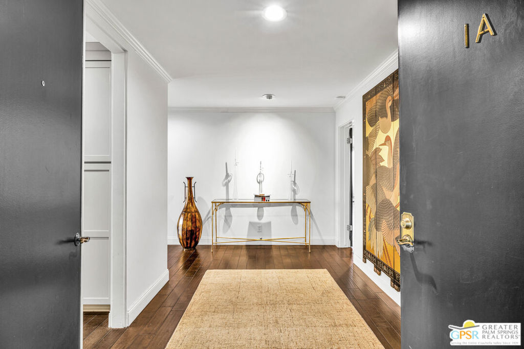 PRICE REDUCTION…….Welcome to the Diplomat, located in desirable South Palm Springs. Enjoy this 2-bedroom, 2 bath condo that has been updated to perfection. Upon entering through the double doors, you’ll find yourself in a grand foyer that sets the stage for this spacious first floor unit, both elegant and comfortable. The primary suite features a custom California walk-in closet and a luxurious bathroom with an oversized shower. The second bedroom has built-in cabinetry including a desk and a Murphy bed which provides flexibility for guests or a perfect home office. The kitchen adds to the beauty of the home with newer cabinets, appliances and new glass tile backsplash. The living room, dining room and both bedrooms open onto large covered balconies through floor to ceiling sliding glass doors and provide beautiful views of mountains, greenbelt and community pool. The outside space is perfect for dining, entertaining and expands the living space by approximately 400 sq ft. An additional standout feature is the privacy, as there are no shared walls with neighboring units. The building offers underground parking with an assigned space and an elevator conveniently close to the unit. The HOA includes Spectrum cable TV, Wi-Fi internet, water and trash, providing a low-maintenance carefree lifestyle or a perfect full time residence. The Diplomat is conveniently located across the street from Smoke Tree Village providing access to markets, shops, pharmacy and restaurants all within minutes. Move-in ready, renovated and beautifully designed, this Palm Springs home offers desert living at it’s finest. Land lease was recently extended to 2089.