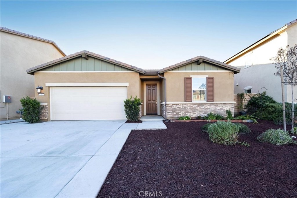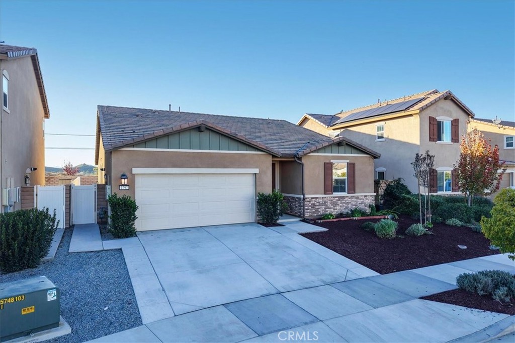 Single-story – Cul-de-sac – No rear neighbors – LVP Flooring Built in 2021, this single-story home is located on a quiet cul-de-sac and offers a functional open-concept layout with no rear neighbors. The kitchen features granite countertops, a large center island, large walk-in pantry, and flows directly into the main living area. Luxury vinyl plank flooring runs throughout the primary living spaces. The primary suite is positioned separately from the secondary bedrooms, providing added privacy, and includes an ensuite bath and walk-in closet. Additional features include a very large laundry room and attached two-car garage. The backyard is fully enclosed with block and vinyl fencing and offers an open rear setting. Front landscaping is owner maintained. The home includes leased solar. Community amenities include a pool, spa, and walking trails. Conveniently located near shopping, dining, regional recreation, and freeway access. Proximity to Diamond Valley Lake and access toward Idyllwild make this location well positioned for both everyday needs and outdoor activities.