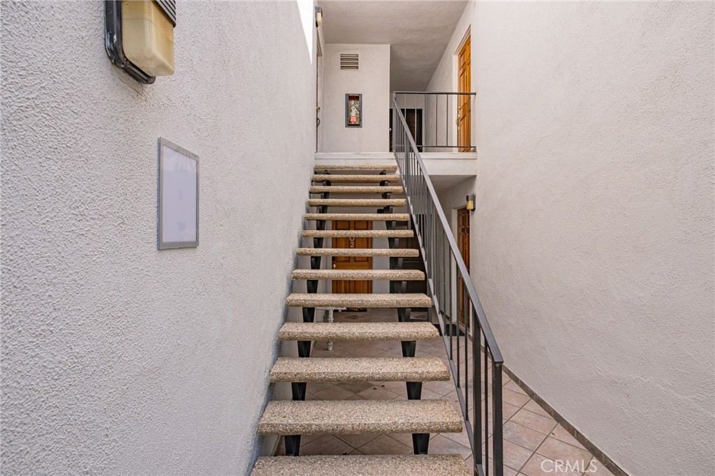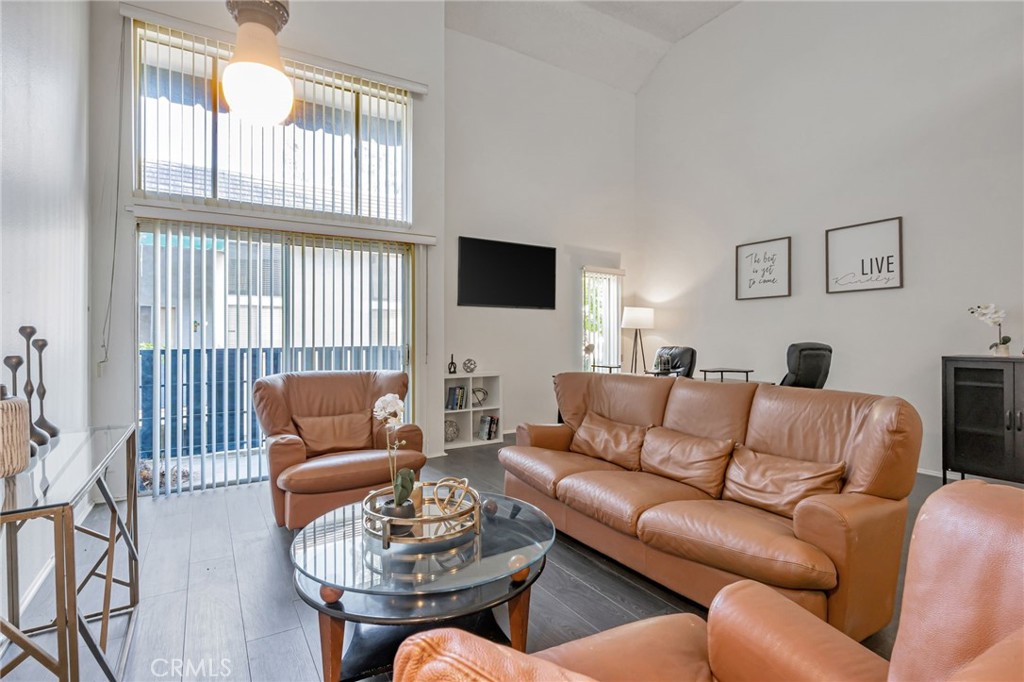 Welcome to this bright and modern 1-bedroom, 1-bath loft-style condominium located in the gated community of California Place. This unique two-level unit features soaring high ceilings and an open-concept layout that creates a spacious and airy atmosphere. The main bedroom and full bathroom are privately located on the upper level, with an open view overlooking the living and dining areas below, giving the home a stylish loft-like appeal. Carpeted stairs lead up to the second floor, where you’ll find the master bedroom, a generous closet and abundant natural light. Downstairs, dark laminate flooring adds a sleek, contemporary touch throughout the living and dining spaces. The kitchen is well-equipped with granite countertops, a stainless steel refrigerator and stove, and a white microwave—perfect for comfortable and functional everyday living. Step out onto your private balcony and unwind to the soothing sounds of a tranquil water feature just outside in the beautifully landscaped common area. This condo includes two assigned tandem parking spaces and access to a wide range of resort-style amenities, including a sparkling pool and spa, a clubhouse for social gatherings, a BBQ area, a fitness center, a sauna, and convenient on-site laundry facilities. Ideal for the first-time buyer ready to stop renting and start building their real estate portfolio, this home offers a rare combination of comfort, convenience, and community in one of the area’s most sought-after gated neighborhoods.