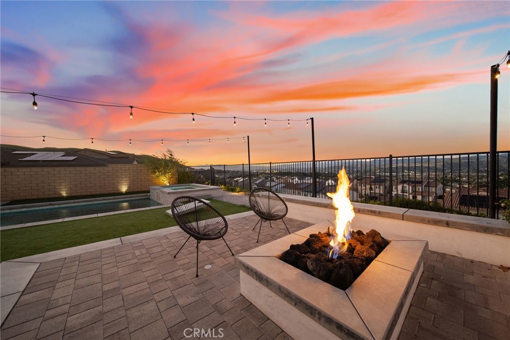 Stunning and luxurious view home in the gated Aliento Community with a resort-style backyard featuring a saltwater PebbleTec pool, spa, fire pit, and panoramic city light views. From the moment you step inside, the open-concept layout is filled with natural light, high ceilings, and a seamless flow between living, dining, and kitchen spaces—ideal for both everyday living and entertaining. A full bedroom and bath on the main level offer flexibility for guests or multi-generational living. The kitchen is both stylish and functional, featuring quartz countertops, an oversized island with bar seating, and a clean, modern design that opens directly to the main living areas. Positioned to take advantage of the home’s elevated setting, the kitchen, dining, and living spaces enjoy a sense of privacy along with beautiful mountain and city views. The real showstopper is the backyard, highlighted seamlessly from the living room through expansive windows and sliding glass doors that open to a covered California room with outdoor dining and led lighting. Designed for both relaxation and unforgettable gatherings, this private outdoor retreat features a sleek saltwater pool and spa, expansive hardscape with turf landscaping, and multiple seating areas. Take in breathtaking mountain and city light views while enjoying evenings under café lighting, hosting around the built-in BBQ, or unwinding fireside as the sky transitions from sunset to night. Upstairs, spacious bedrooms and a light-filled primary suite capture scenic views, creating a peaceful retreat to start and end your day. Enjoy daily panoramic views and evening city lights from the primary bedroom, enhanced by convenient remote-operated window coverings. The closet space is a dream with 15′ in depth and 11′ wide. Secondary bedrooms are thoughtfully positioned to capture natural light and surrounding views. Thoughtfully upgraded throughout, the home also offers energy efficiency with paid-off solar, a 3-car garage, and a location that combines privacy with convenience—just minutes from shopping, dining, and community amenities. This is more than a home—it’s a lifestyle defined by views, design, and the way you live every day.
