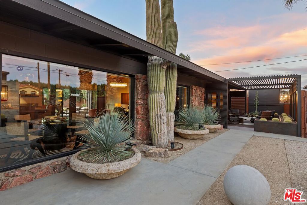 A secluded desert retreat where architecture, landscape and light move in quiet harmony. Set behind a private gate, this extensively remodeled mid-century residence offers a rare balance of refined design, intentional layout and effortless indoor-outdoor living, framed by open skies and mountain silhouettes. At the heart of the home is an expansive great room where the kitchen, living and dining areas unfold as one continuous, light-filled space. Clean modern lines, exposed original wood beam ceilings and curated textures create a sense of grounded luxury, while expansive glass sliders stretch along the perimeter, dissolving the boundary between inside and out. The kitchen anchors the space both visually and functionally, featuring sleek custom cabinetry, integrated appliances, open shelving and a dramatic central island designed for gathering, cooking and conversation. The primary suite occupies its own private wing, offering a serene retreat with generous proportions, direct outdoor access and a spa-like bath complete with dual vanities and a glass-enclosed shower. A spacious walk-through closet and private patio enhance the sense of retreat and separation from the rest of the home. On the opposite side, three additional bedrooms with private patios and two spa-like baths are thoughtfully arranged, creating a comfortable guest or family wing. Outside, the property truly comes alive with a resort-style pool surrounded by sculptural desert landscaping and multiple lounging zones designed for slow mornings and golden-hour evenings. The seamless connection between the interior and outdoor spaces allows the home to live as beautifully outside as it does within. Located just 10 minutes from Palm Springs, this stunning property was created for those who value intentional living, privacy and timeless desert style – a place where modern design meets the restorative rhythm of the desert.
