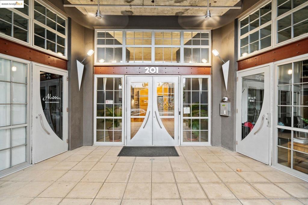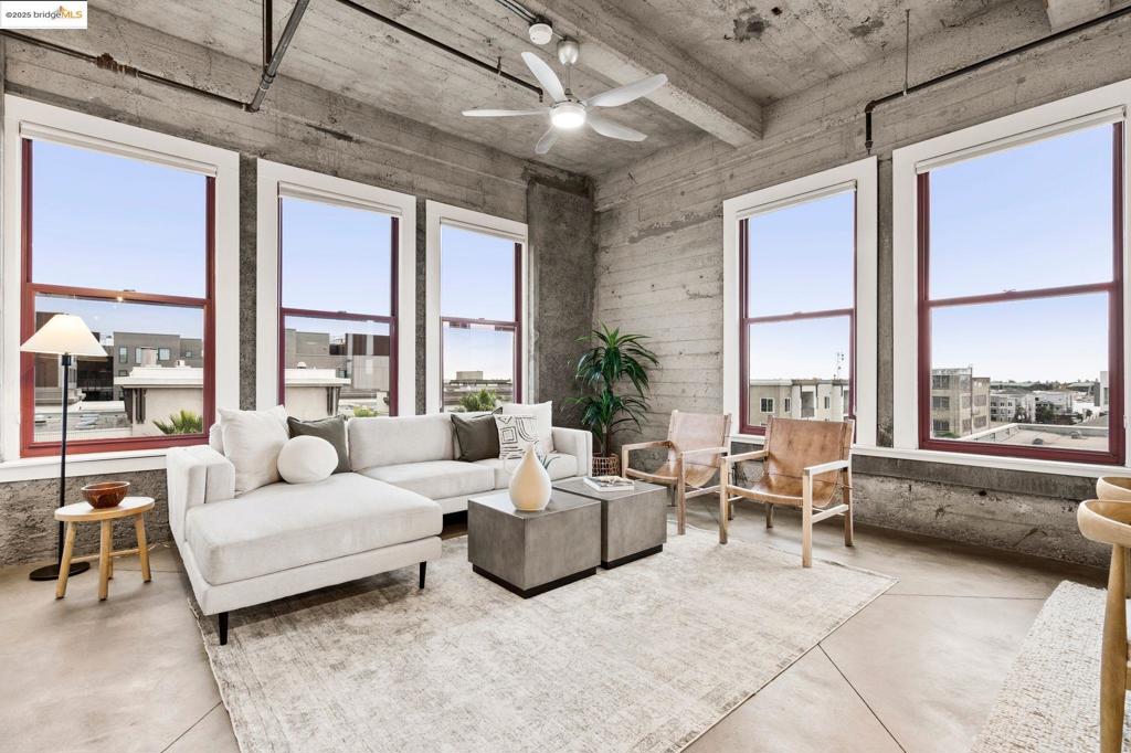 This beautifully updated, modern, single-level condo in The New Market Lofts building in the heart of Jack London Sq offers premium living and an exceptional urban lifestyle. A premium corner unit, this extraordinary & spacious 2 bedroom, 2 bath, 1,343+/- SF residence features soaring 12′ textured concrete ceilings with many architectural details from the original construction as the Safeway Corp headquarters. A modern, open concept floor plan enjoys stylish cement stone flooring, designer lighting, and beautifully updated kitchen complete w/ breakfast bar, stainless steel appliances, and modern cabinetry. Wall-to-wall windows bathe this captivating space in loads of natural light and views of Jack London Sq on to the Oakland Estuary. An expansive primary ensuite delivers a luxurious owner experience with premium walk-in shower with dual showerheads, double vanity, and large walk-in closet. New Market Lofts features an array of premium amenities including a fitness center and roof top deck, as well as 2 deeded tandem parking spots (#45 & #46) in secure garage. This premium location enjoys some of Oakland’s best dining, shopping and entertainment right outside your front door. Commuting couldn’t be easier with Ferry service to SF just steps away, and just minutes to BART.