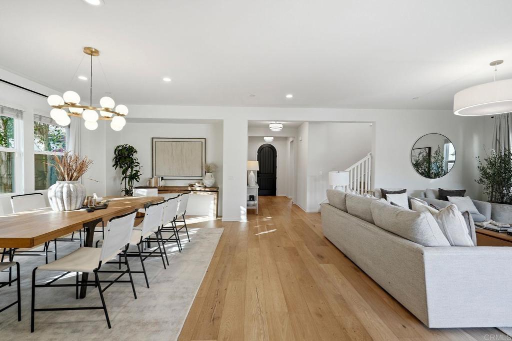 Beautiful light-filled interiors with beautiful white oak hardwood floors set the tone in this modern Harmony Grove home designed for true indoor–outdoor living. From the moment you enter, multi-panel sliders and 8-foot stacking doors open the kitchen, dining, and living areas to the backyard, creating a seamless flow that makes the home feel open, warm, and connected. The main level offers clear sightlines from the kitchen to the pool, blending daily living with outdoor entertaining. Two covered California rooms—both upgraded with wood-look tile—extend the living space year-round and anchor a private, low-maintenance backyard. A highly upgraded pool and raised spa, turf, mature landscaping, and owned home + pool solar create a resort-style setting that’s simple to care for. Inside, the entry level includes a dedicated office and a full bedroom with ensuite bath, offering ideal flexibility for guests, multigenerational living, or work-from-home needs. Upstairs, a spacious loft centers the bedroom wing and functions as a media, lounge, or homework space. The luxury primary suite features two walk-in closets, dual sinks with designer backsplash, a soaking tub, a walk-in shower, and upgraded tile flooring. Two additional bedrooms and updated bathrooms complete the upper level, all filled with natural light and thoughtful storage. Additional upgrades include a QuietCool whole-house fan, rain gutters, premium finishes, and a three-car garage with brand-new epoxy flooring, a full Gladiator storage system, and a Tesla Level 2 charger. New Tankless Water Heater Installed last year. Set on a quiet street with neighbors positioned farther back across the way, the home enjoys an open, spacious feel from the front while maintaining a peaceful setting. Close to walking trails, parks, and amenities, this home blends luxury, efficiency, and indoor–outdoor living into one beautifully designed space.