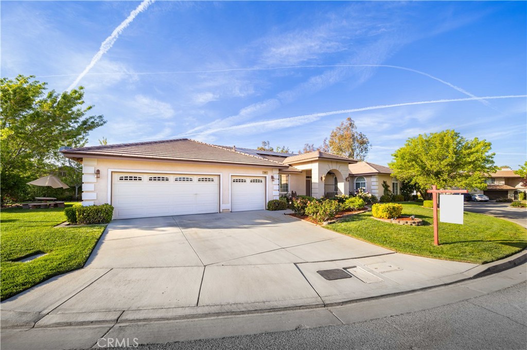 PAID SOLAR IS INCLUDED WITH THIS STUNNING HIDDEN GEM SINGLE STORY HOME IN THE PRESTIGIOUS AV FAIRWAY ESTATE OF WEST PALMDALE, just steps from the 7th hole of the Antelope Valley Country Club golf course!! Nestled on a quiet cul-de-sac, this impressive property offers over 3,000 sq. ft. of beautifully updated living space on a sprawling 16,403 sq. ft. lot!! Owner is in the process of adding ALL NEW WROUGHT IRON GATES AND FENCING in the backyard and across the Westside front side yard!! The open floor plan features soaring cathedral ceilings, a spacious family room with cozy fireplace, formal living room, and elegant dining area!! The gourmet kitchen shines with black granite countertops, upgraded appliances including double ovens and NEW gas range, NEW dishwasher and a sunny breakfast nook!! This thoughtfully designed home offers 4 bedrooms and 3 baths, including a luxurious master retreat with double-door entry, spa-like bath with Roman-style jacuzzi tub, separate shower, dual sinks, and a large walk-in closet!! Secondary bedrooms are generously sized, with a convenient Jack & Jill bath!! Upgrades include radiant heated tile floors, Berber carpet in bedrooms, plantation shutters, custom draperies, central heat/air, and PAID SOLAR for year-round savings!! Step outside to your private backyard oasis featuring lush landscaping, rose bushes, fruit trees (apricot, cherry, plum, apple, blackberry), a full-length covered patio, and an above-ground jacuzzi under a gazebo. The 3-car garage includes a home gym area for added versatility!! Located in a quiet, established neighborhood with golf course access, this home blends elegance, comfort, and functionality; truly a rare find!!