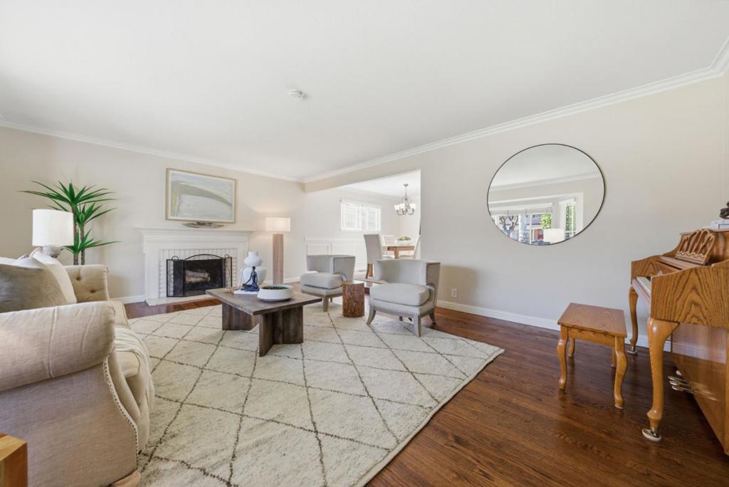 This home has room for a growing family with many bedrooms and a variety of tranquil living areas. Located on a quiet street, and walkable to Doerr Park, this home comes with great public schools. There is a neighborhood pool and tennis court and new owners are eligible for membership with a fee. For a family, this can be an idyllic setting to live out the American dream of owning a home. This two-story home has many of the features people seek such as hardwood floors throughout, a remodeled kitchen with new stainless appliances and a gas cook top with range hood and double ovens for the gourmet chef. The kitchen has ample storage in Maple cabinetry with quartz counter tops that include a small breakfast bar. The kitchen and adjacent family room with recessed LED lights and sliding door access to the back yard. Formal dining area has easy kitchen access and wainscotting like wall elements. Near the entrance, the step-down living room has a large bay window facing the lovely front yard. There’s crown molding and a wood burning fireplace to provide that cozy warmth when you want. Kids’ rooms are colorful. Also central heating and AC, a Nest thermostat, and dual pane windows. The back yard has a slate hardscape and both a pergola and a pavilion. Front and back have lovely foliage.