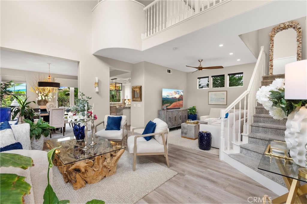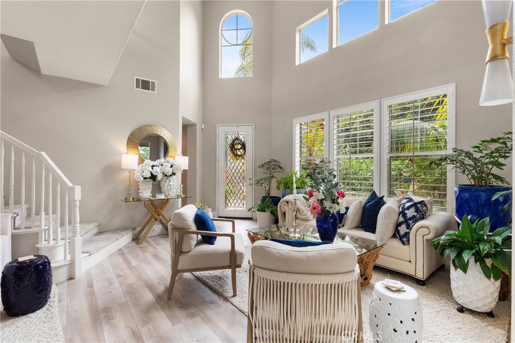 Stunning residence located at 27791 Camino Del Rio within the gated San Juan Hills community in San Juan Capistrano, offering an open floor plan, mountain and city light views, and a golf course setting with no ball exposure. Thoughtfully designed for entertaining and everyday living, the home showcases quality craftsmanship and high-end finishes throughout. The gourmet kitchen features quartzite countertops, a large center island with additional storage, a marble farmhouse sink, walk-in pantry, and premium appliances including a Dacor 42-inch refrigerator, Monogram cooktop and oven, Advantium microwave/oven, and pull-out oven fan. The kitchen opens seamlessly to the main living areas highlighted by a gas fireplace. A light-filled loft provides flexible space suitable for a home office, lounge, or secondary living area. The primary suite includes a spa-inspired bathroom with a large walk-in shower, glass sinks, and dual vanity mirrors. Interior features include shutters throughout, four ceiling fans, and luxury vinyl tile flooring on the main level. Outdoor living areas are designed for indoor-outdoor flow and entertaining, featuring a wrap-around patio, paved entry courtyard, tranquil fountain, hardscape lighting, and a built-in grill and bar with granite counters and stove, positioned to capture scenic mountain and city light views. Additional features include epoxy garage flooring, new garage door opener, Tesla EV charger, Water Boy whole-house filtration system, ADT security system, glass-designed front door, disappearing front and rear screen doors, French doors, new tile roof, primary bedroom security screen, overhead garage storage racks, and under-stair storage. Enjoy a private, elevated setting with access to community amenities including a pool, spa, and equipped fitness center, along with nearby shopping and dining, scenic trails, and approximately 1.5 miles to downtown San Juan Capistrano.
