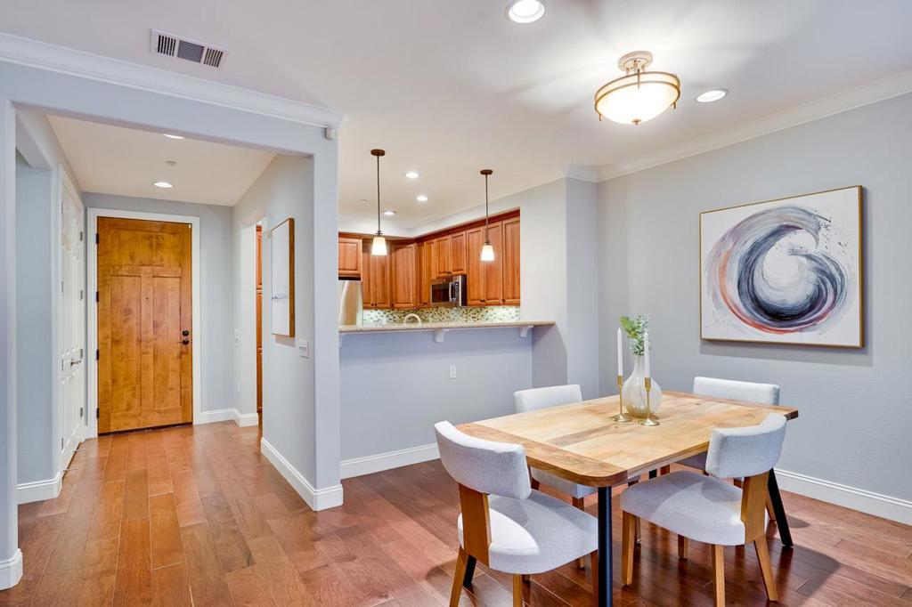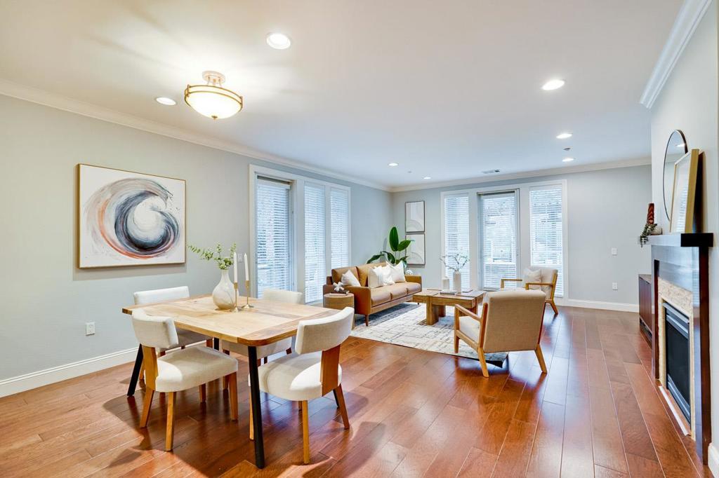 This one is a beauty! A prime ground floor corner unit in the charming Willow Glen Place! The comfortable living space features rich hardwood floors and two walls of doors and windows opening to a large wrap-around private patio in a quiet corner of the community. The high ceilings with crown moldings, custom window blinds and a gas fireplace complete the sophisticated look. The chef’s kitchen features stainless steel appliances, gas range, dark wood cabinetry and granite counters with a convenient breakfast bar. The spacious primary suite has a luxurious bath with a dual sink vanity, deep soaking tub and a separate walk-in shower. The second bedroom is also spacious and has custom window treatments. Both bedrooms feature new carpeting and large walk-in closets outfitted with Elfa organizers. The central heat and A/C is controlled by a Nest thermostat. There are two designated parking spaces in the secure, underground garage and an additional private storage locker. Willow Glen Place is a well-kept and sophisticated community with a fully equipped gym, pool and spa and secure common areas with serene landscaping. It is ideally located within walking distance of local businesses and with easy access to shopping and convenient commute routes. What a great place to call home!