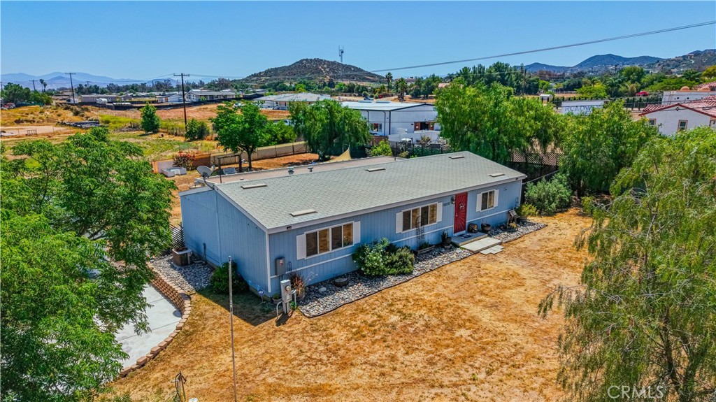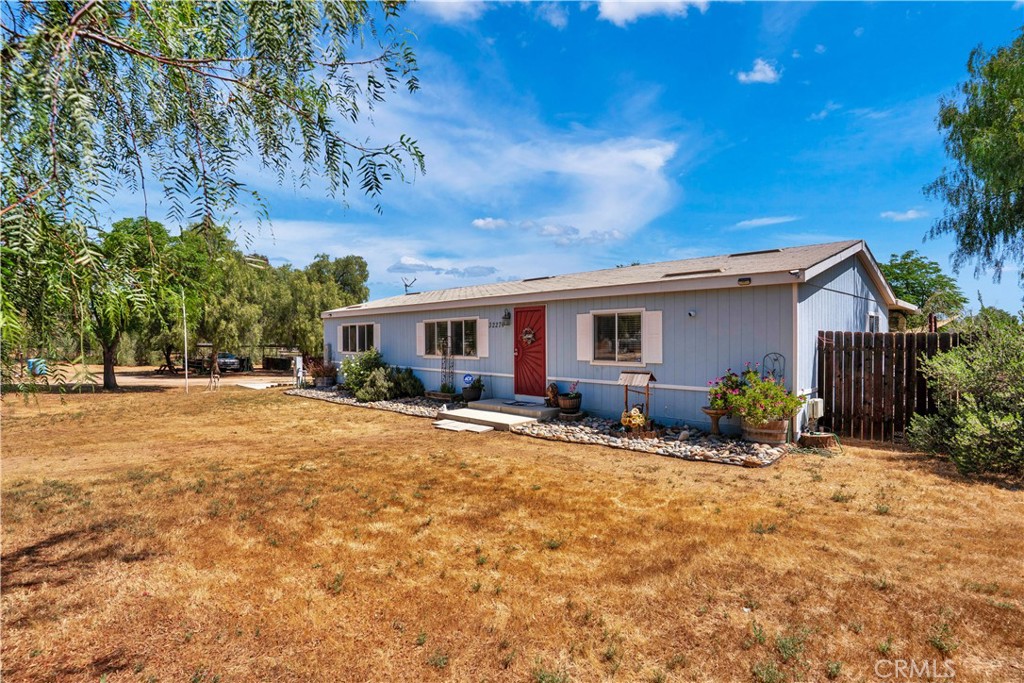 Welcome to your private country retreat in Menifee! Situated on 2.32 usable acres, this well-maintained 2002 manufactured home on a permanent foundation offers space, comfort, and versatility. Featuring 3 bedrooms, 2 bathrooms, and 1,456 sq ft, the home showcases an inviting open kitchen with updated kitchen cabinetry, tile backsplash, newer range and microwave, decorative lighting, and a center island -perfect for both everyday living and entertaining. Tile flooring flows through the kitchen and dining areas, while the living room and primary bedroom feature wood flooring, creating a warm and functional living space. The spacious primary suite includes an en-suite bathroom with dual sinks and a walk-in shower. The secondary bedrooms offer newer carpet and walk-in closets, providing comfort and ample storage. Additional interior highlights include raised panel wood doors, dual pane windows, blinds, ceiling fans, and an indoor laundry room. Step outside to enjoy the covered rear porch, ideal for relaxing and taking in the peaceful country views. The property is well suited for rural living and animal use, featuring multiple pipe corrals/stalls, a tack shed, and plenty of usable land. Additional features include detached 2-car garage, SOLAR system to be paid off at close of escrow, newer hot tub included, two storage sheds, security screen doors (front & back), propane tank, low taxes & NO HOA, and room for RVs, trailers, and more. This is a rare opportunity to own a versatile acreage property with room to grow, relax, and enjoy country living, just minutes from city conveniences.