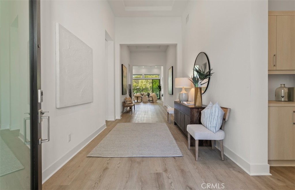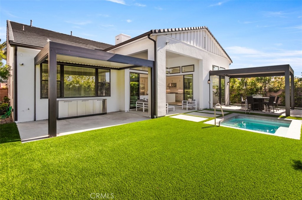 Tucked behind the gates of Pacifica San Juan’s coveted Ocean Hills enclave, this rare single level elevation model embodies relaxed coastal sophistication. Designed for effortless living and entertaining, the home features four bedrooms and four-and-a-half baths, each guest suite offering its own private retreat with walk-in closet and en-suite bath. The primary suite enjoys tranquil views of the backyard and includes a spa-inspired bath with a sunken tub, separate shower, dual vanities, and an expansive walk-in closet. The heart of the home centers around a light-filled great room with soaring ceilings, French Oak luxury vinyl plank flooring throughout, a sleek fireplace, and disappearing slider doors that seamlessly blend the indoors with the outdoors. The chef’s kitchen impresses with a nine-foot island, high-end stainless steel appliances, large walk-in pantry, and abundant storage — perfect for gatherings large or small. Hardwood flooring flows throughout, complemented by tile in the baths and a palette of warm, neutral tones that enhances the home’s airy ambiance. Outside, two covered patios with an amazing display of electric awnings and shades, overlook a sparkling jetted, heated, plunge pool, creating the ideal setting for sunset dinners or lazy weekend afternoons. Every detail of this refined coastal haven celebrates the beauty of single-level luxury living in San Juan Capistrano.