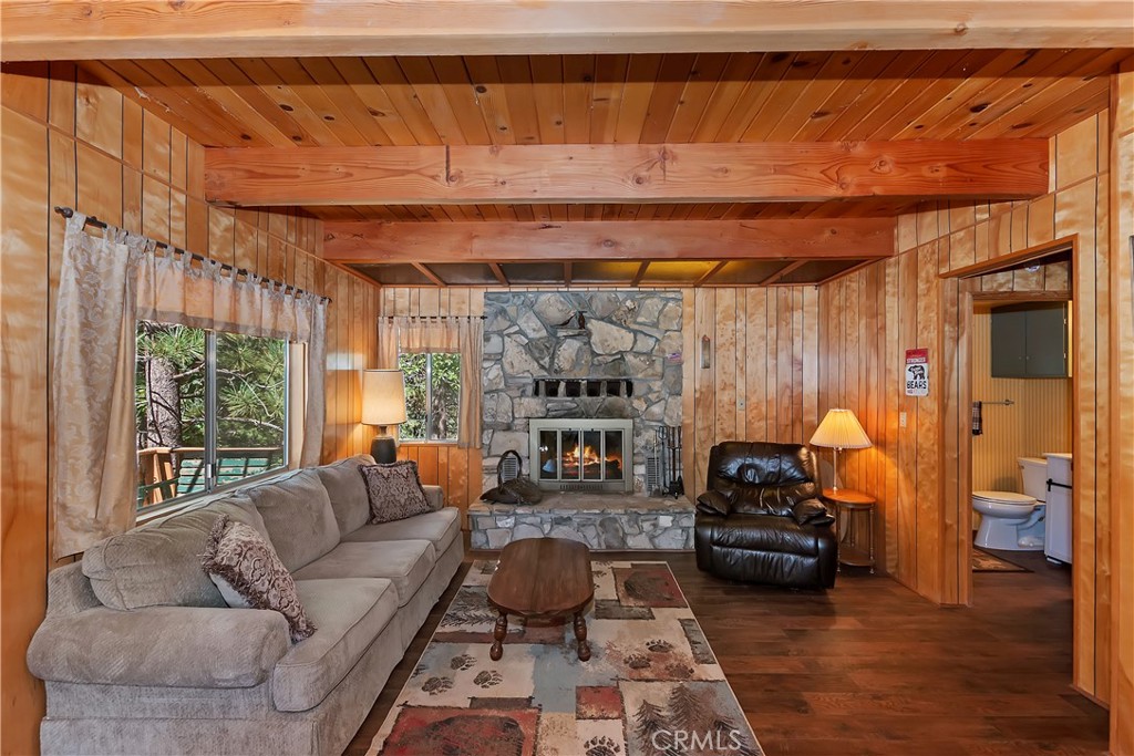 A beautiful mountain cabin in the quaint community of Green Valley Lake. Original features include a granite fireplace and wood beam ceilings. A complete kitchen with attached eating area bring family and friends together for a home cooked meal, holiday feast or games galore. Two bedrooms are upstairs with vaulted ceilings. Large downstairs area can be a primary suite or family room with attached bath. Also area for laundry hookup. Indoor access to build-up area and “man cave”. Plenty of parking on a long private driveway. A great price for a weekend get away!