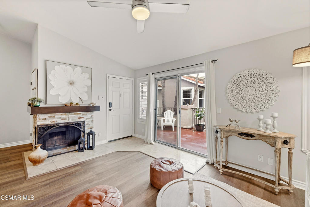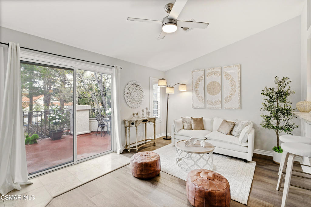 Step into this beautifully updated top-floor, 2-bedroom, 2-bath home featuring soaring ceilings, wood-like flooring, recessed lighting, and a cozy gas fireplace. The open-concept layout offers a spacious living room that flows seamlessly to a large private deck nestled among the treetopsperfect for relaxing or entertaining. The kitchen boasts tile flooring, stainless steel appliances, custom cabinetry, granite countertops, a stylish peninsula with bar seating, and elegant pendant lighting. Both bedrooms feature ceiling fans, as does the family room, while wood shutters throughout provide privacy and a touch of elegance. Bathrooms have been tastefully remodeled with modern vanities and finishes. Additional highlights include double-pane windows, a sliding glass door, and a private 2-car tandem garage. Conveniently located in the heart of Thousand Oaks and Westlake Village, this home offers access to the community pool and spa, plus all the shopping, dining, and outdoor recreation the area has to offer!