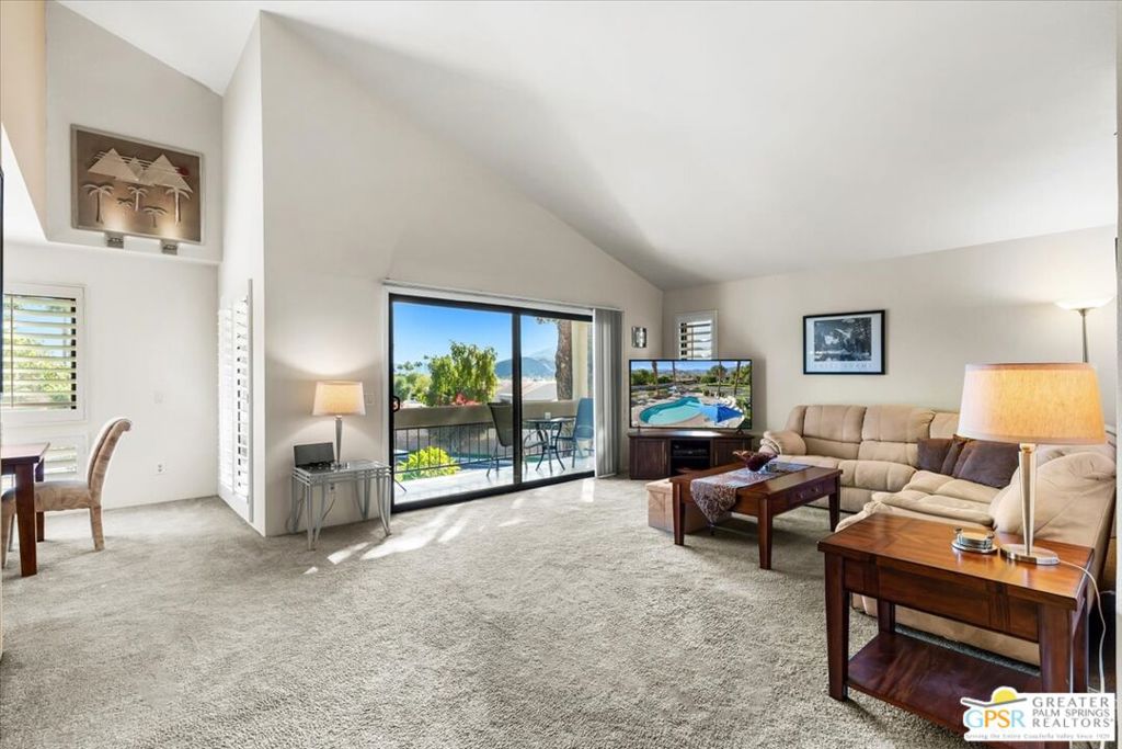 First time on the market in 25 years, this upper-level end unit in Canyon Shores offers a peaceful setting with sweeping mountain views and thoughtful updates throughout. The residence features two bedrooms and two baths and is offered fully furnished, creating a comfortable and welcoming retreat from the moment you arrive. The home includes newer windows and an upgraded sliding glass door for enhancing energy efficiency and showcasing the dramatic San Jacinto Mountain backdrop. Vaulted ceilings bring an airy sense of volume, while the private balcony frames a dramatic mountain view and lush greenbelt that exemplify the relaxed Coachella Valley lifestyle. Canyon Shores provides an exceptional collection of amenities, including multiple pools and spas, tennis and pickleball courts, a fitness center, and well-maintained grounds. The HOA covers water, trash, landscaping, and newly installed community roofing in 2025, offering convenience and ease of ownership.Ideally positioned between Palm Springs and Palm Desert, the home enjoys quick access to shopping, dining, golf, local attractions, and the CV Link. Whether used as a full-time residence or a quiet weekend escape, this well-kept desert home delivers comfort, quality, and a superb location.