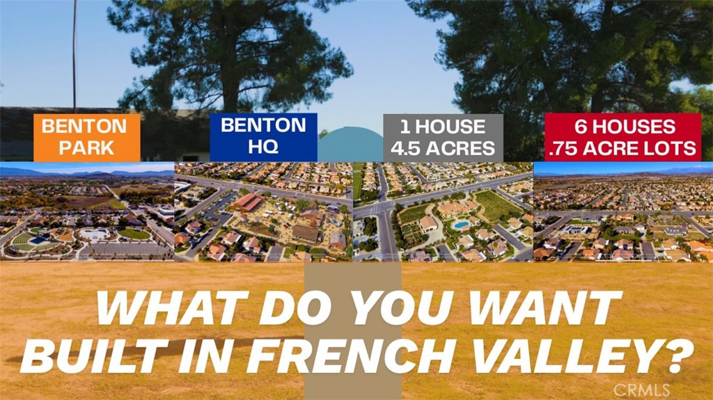 The Sunset Ranch on Benton provides ample opportunities. Currently zoned for a single-family home on 4.36 Acres, this property may present an opportunity for rezoning through the county of Riverside. Whether you are potentially subdividing into several smaller lots, hoping for a live and work environment, looking at the Sunset Ranch for the next city or county development project, or for the possibility of commercial revenue, The Sunset Ranch on Benton is centrally located on Benton Rd, the closest thing to a “Main Street” in French Valley. Benton Rd runs through French Valley, becoming Clinton Keith at the 79S, eventually hitting both the 215 and 15 Freeways.The property is also close to housing, shopping, and commercial development, and is mostly flat and usable. It sits in the heart of French Valley, on the Main Street, in an unincorporated community of Winchester, California. This area sits in the highly desirable Temecula Valley Unified School District.Here are some possibilities to consider if rezoning is achieved through the county. Renderings have been provided in the pictures. Option 1: “Benton Park” would follow the layout of several 5-acre parks throughout the country, with an amphitheater, playground, walking trails, and a skate park. This would be a great place for French Valley residents to gather with friends and family, or for community events. I’d love to see the County of Riverside, or the City of Temecula, make this possible. Option 2: I call it “Benton Headquarters”, a shopping center like Vail Headquarters in Southern Temecula, which features several smaller local shops, bringing back opportunities for residents, local shopping, food, fun, performances, and music. Building community and memories, while generating commercial revenue for ownership. Or Option 3: “Housing” Keep this as a single-family home for one family on a large lot, or multiple families, subdividing into 6 lots, each about ¾ of an acre. These homes would feature Temecula Valley Schools, large flat usable lots, and would be walking distance from parks, restaurants, and shopping. Perfect for a family compound, or a smaller developer. For a property like this one, the possibilities are endless. Everything would have to be approved, permitted, and rezoned with the county, but an opportunity like this only comes along – once in a great while…It would be nice to see something good for French Valley, and the people who live here.