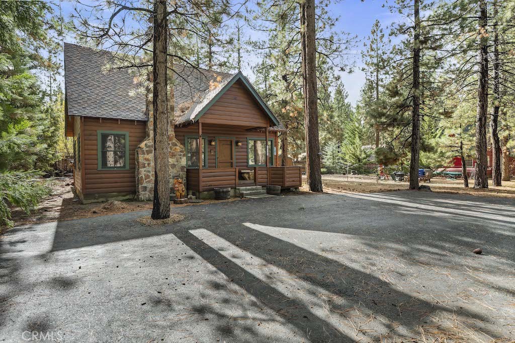 Introducing a charming 1,226 sq ft log cabin nestled in a serene, heavily treed area of Big Bear Lake! This inviting 3-bed, 2-bath retreat blends classic mountain character with rustic elegance. Warm Knotty Pine accents and a striking native rock fireplace create a cozy lodge feel, while the country-style kitchen—complete with a generous pantry—offers great functionality for everyday living or weekend escapes. A separate laundry area adds convenience. The well-designed layout includes a main-level bedroom, with additional bedrooms upstairs for added privacy. Step outside to a spacious back deck, perfect for relaxing among the pines or entertaining guests. Situated on a 9,000 sq ft lot, the property provides a peaceful, wooded setting, and the detached garage offers excellent storage for mountain toys! Located close to the lake and just a short drive to the Village, restaurants, shops, and ski resorts, this home is ideally positioned for year-round enjoyment. A wonderful opportunity to own an authentic Big Bear retreat in one of the area’s most desirable neighborhoods.