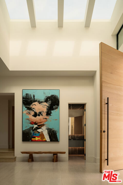 Located in the most prime section of Beverly Hills behind private gates on over half an acre of flat, fully usable land, this single-story contemporary residence blends architectural character with warm, livable design. Soaring 12-foot ceilings and skylights throughout create an open, sunlit flow from the kitchen to the family room, anchored by a wet bar and floor-to-ceiling pocket doors that open seamlessly to the grounds. The home’s four bedrooms include a dramatic primary suite with retractable glass walls overlooking the pool and lush landscaping cultivating an effortless indoor-outdoor connection that defines the California lifestyle. The pool and spa serve as the centerpiece of the outdoor living space, offering a tranquil backdrop for daytime lounging and evening gatherings. Designed for both everyday living and entertaining, the home features a professional movie theater with stadium seating, a custom bar, and multiple outdoor gathering areas framed by mature trees for total privacy. Additional highlights include a 3-car garage, ample guest parking, and an exterior carport for security. At twilight, the property glows with its modern lines and layered landscape lighting creating a resort-like ambiance in the heart of Beverly Hills.