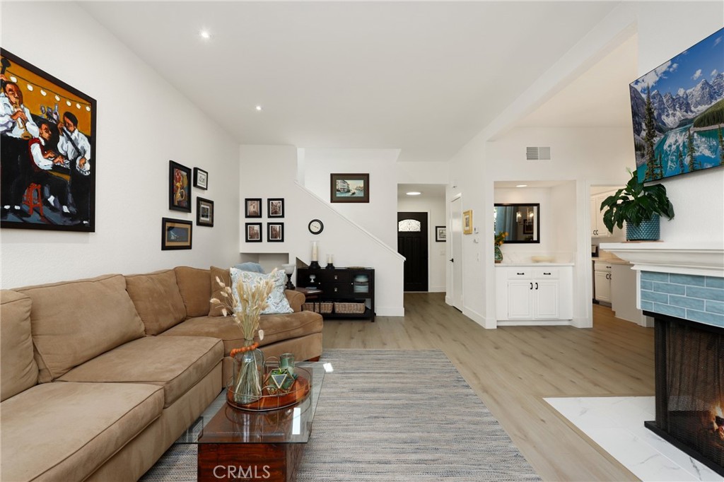 Beautifully remodeled coastal retreat in the prestigious, gated Las Fuentes community of Huntington Harbour. This 3-bedroom, 2.5-bath home features soaring 10-foot ceilings, new dual-pane windows (2022), upgraded electrical panel, and premium waterproof laminate/vinyl flooring throughout. The updated kitchen offers quartz countertops, stainless steel appliances, a built-in microwave, full-size refrigerator, dishwasher, and wine fridge, plus a cozy breakfast nook and direct access to the attached two-car garage. The open layout flows into a dining area with fireplace and sliding doors leading to a private patio with lush landscaping, lemon and lime trees, and a gas BBQ—perfect for outdoor living. Upstairs, the spacious primary suite includes vaulted ceilings, a private balcony, sitting area, a walk-in closet, dual vanities, and an upgraded walk-in shower. Two additional bedrooms share a balcony and a fully remodeled bath April 2026, with convenient upstairs laundry. Additional features include a remodeled powder room, ample storage, a water purifier, Levelor blinds, new front entry hardscape, and recent termite and stucco work. Enjoy added privacy with no rear neighbor. Community amenities include a pool, sauna, and beautifully maintained grounds. Ideally located near Huntington Harbour Mall, local dining, shops, and just minutes from the water for kayaking, paddleboarding, and beach days, with easy access to top schools, parks, freeways, and Long Beach Airport.