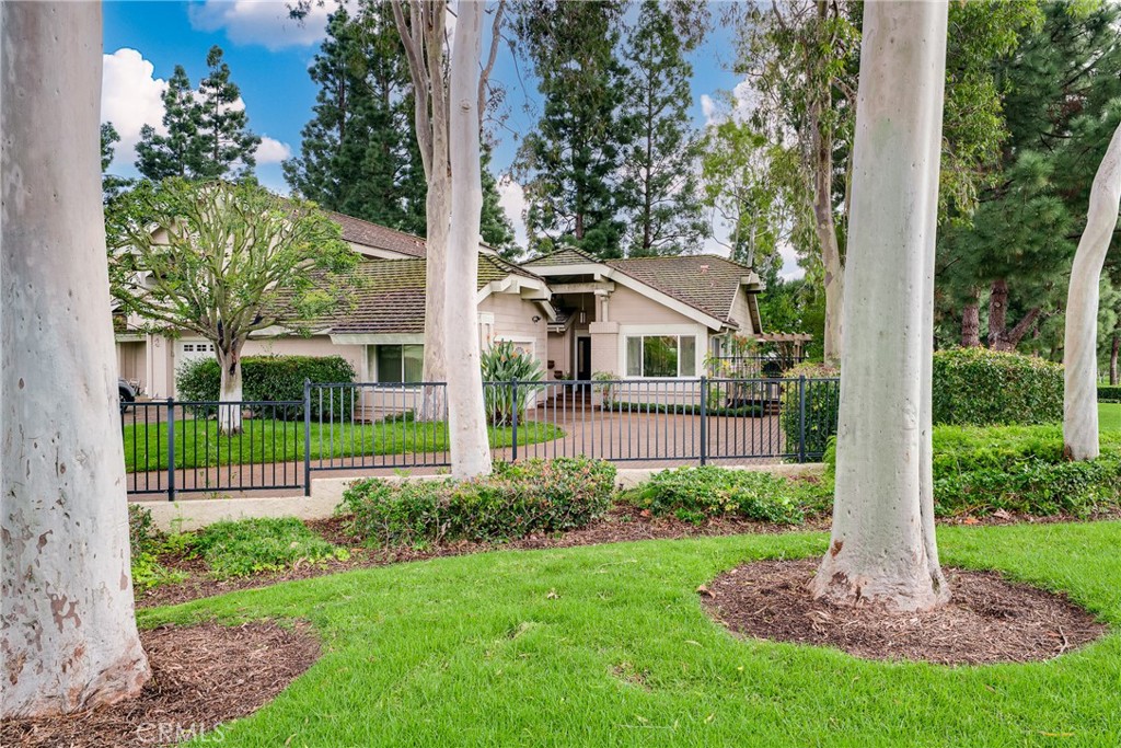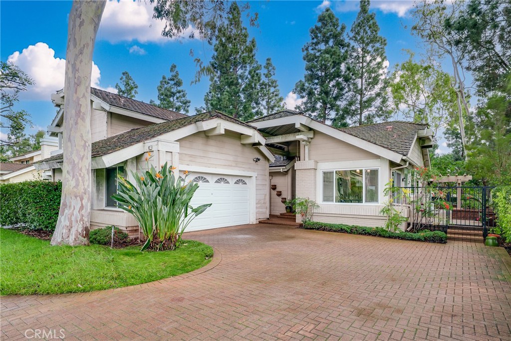 Experience refined living in this meticulously remodeled single-story residence, situated on a premium cul-de-sac lot within the prestigious Highlands Garden community. The home makes a grand first impression with a long, sweeping brick-paved driveway that leads gracefully to the front entrance. Positioned directly adjacent to a lush greenbelt, the property offers breathtaking views of the park and surrounding mountains. The extensively renovated interior features an expansive open-concept layout with vaulted ceilings, designer flooring, and an abundance of natural light. At the heart of the home is an open kitchen boasting quartz countertops, custom cabinetry, and premium stainless-steel appliances. A charming garden window and breakfast nook provide a serene vantage point to enjoy the natural beauty of the landscape. The thoughtful floor plan includes three bedrooms—including two primary suites—and a versatile den. The main primary retreat is a sanctuary of privacy, featuring its own secluded courtyard with a private entry and peek-a-boo views of the greenbelt. This suite further offers dual vanities, a walk-in closet, and a spa-inspired shower. The secondary suite—with the attached den—features a flexible space ideal for a home gym or office, with direct access to the lush backyard. Located closed to the community park, pool and spa, and minutes from UCI, University High School, and world-class shopping at South Coast Plaza and Fashion Island, this home offers the perfect blend of tranquility and urban convenience.