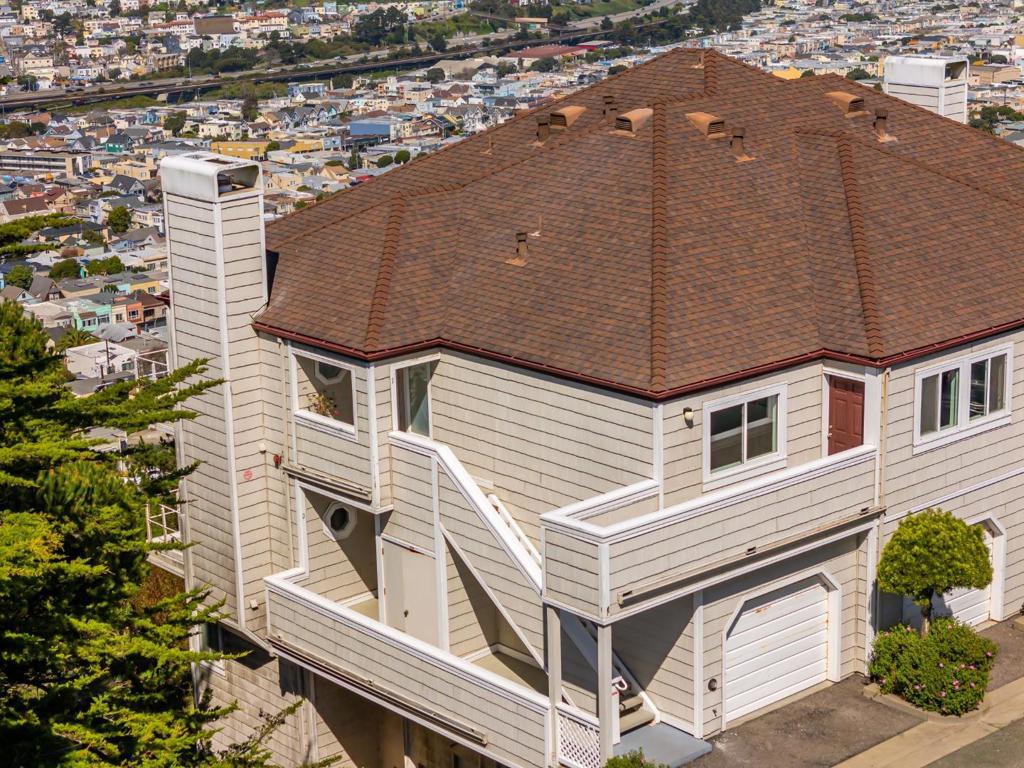 Beautifully updated condo offering spacious interiors, and sweeping city and coastal views. The main living area features hardwood flooring, recessed lighting, high ceilings, and a cozy gas fireplace that anchors the bright living room. The deck off the living room captures impressive views toward Lake Merced, Ocean Beach, Twin Peaks, and the downtown SF skyline. The updated kitchen combines style and functionality with quartz countertops, SS appliances, and modern cabinetry. High ceilings in both the living room and bedrooms enhance the open, airy feel of the home. The primary suite also features a private deck and spacious bathroom, fully tiled, double sinks and a modern stall shower. Residents enjoy access to a variety of community amenities including a clubhouse with event space, kitchen, and lounge area available for private gatherings, fitness center and dry sauna, beautifully landscaped grounds with scenic sitting areas and gated entry for added privacy. The community also offers expansive greenbelt areas and direct proximity to the trails of San Bruno Mountain State Park. With thoughtful upgrades throughout, multiple outdoor deck spaces, and access to amenities, this home offers a rare blend of comfort, convenience, and stunning Bay Area views.
