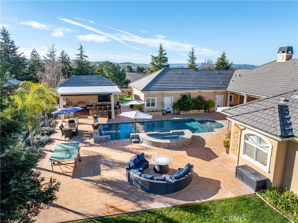 Perched at approximately 1,100 feet in elevation with sweeping 360-degree hilltop views, this estate offers a rare and exceptionally 20± acres featuring two residences, a barndominium, workshop facilities, resort-style outdoor living with pool, spa, solar, and a boutique vineyard. A dramatic 700-foot tree-lined driveway leads to a circular drive, setting the tone for this private estate. The main residence is a 3,842± square foot custom home, designed for everyday comfort and entertaining. The home offers two formal bedrooms plus a flexible room ideal for a home office, den, or optional third bedroom, along with 2.5 bathrooms. Architectural highlights include vaulted ceilings, curved archways, mahogany tray ceilings, marble flooring, copper chimney caps, and panoramic views. The chef’s kitchen features custom cabinetry with Raymond Enkeboll wood carvings, Sub-Zero refrigeration, a BlueStar 8-burner range with double ovens, Fisher-Paykel double dishwashers, wine bar, walk-in pantry, and oversized center island. The primary suite offers direct pool and spa access, a walk-in closet, dual vanities, and a jetted soaking tub. The attached three-car garage is fully finished with epoxy floors, storage, and a Tesla charger. The second residence, is a 1,588± square foot 3 bedroom, 2 bath home with wood floors, vaulted ceilings, custom cabinetry, gas fireplace, tankless water heater, attached two-car garage, and private outdoor space. A 2,100± square foot barn provides workshop and storage space, high bay roll-up door, solar array, split HVAC, and access to a private apartment. The barndominium includes approximately 750± square feet with bedroom, bunk room, bathroom, covered patio, plus an additional 495± square foot bonus or hobby room. Outdoor living includes a 20×40 pool and spa, water features, fire bowls, outdoor shower, and an outdoor kitchen with gas grill, Fontana Forno Italian wood burning pizza oven, Santa Maria grill, smoker, kegerator, and pergola. Amenities include a putting green, bocce court, chicken coop, landscaping, and an east-facing view deck. The property features two wells, two septic systems, 40,900± gallons of water storage, fire sprinklers, smart irrigation, automatic gate, chip seal driveway, and fencing. Approximately two acres are planted to Aglianico and Cabernet Franc vines. A turnkey estate offering privacy, infrastructure, lifestyle amenities, and income potential, just minutes from Paso Robles, Templeton, and Atascadero.