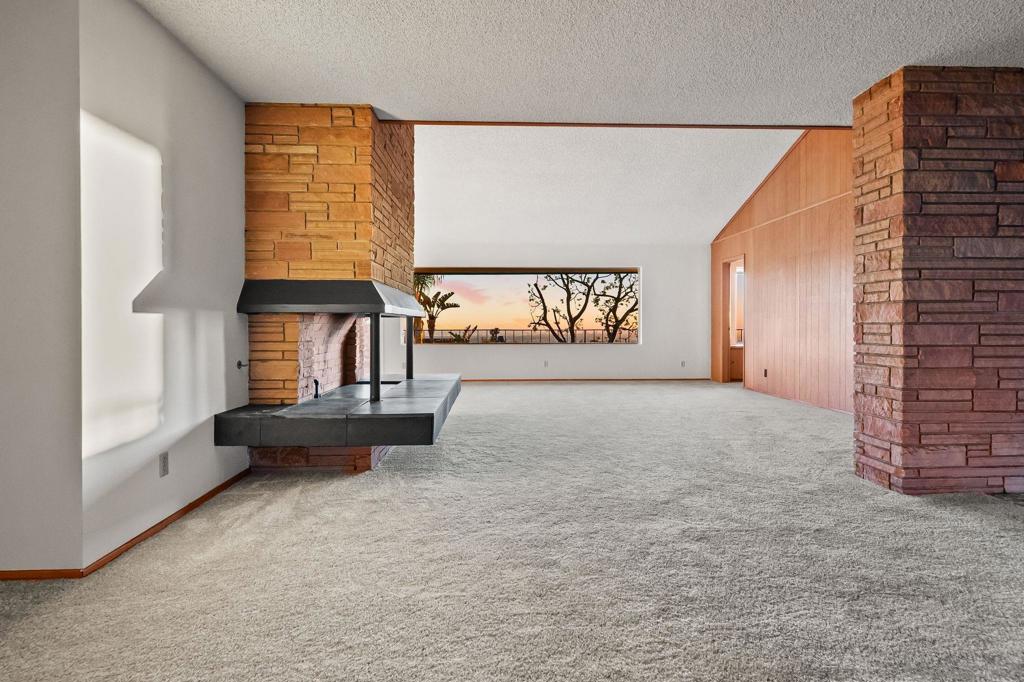 Sweeping panoramic views set the stage for this single-level mid-century modern residence, perched on one of the highest streets in Del Cerro Highlands with sightlines spanning the mountains, downtown skyline, bay, Coronado Islands, and the Pacific Ocean beyond. By day, the San Diego landscape stretches for miles; by night, the city lights create a dramatic backdrop. Offering over 3,000 square feet, the flexible floor plan includes four bedrooms plus a den or optional fifth bedroom and three and one-half bathrooms. Signature mid-century elements, such as clean lines, a dramatic floor-to-ceiling stone fireplace with floating hearth, warm wood paneling, vaulted ceilings, and walls of glass, combine to create a timeless architectural foundation. Fresh interior paint and new carpet provide a blank canvas, while the generous layout and expansive view deck open the door to endless design possibilities. The single-level footprint enhances livability, and the elevated positioning maximizes both privacy and perspective. A rare opportunity to renovate, restore, or reimagine a spectacular view home in one of Del Cerro’s most sought-after enclaves.