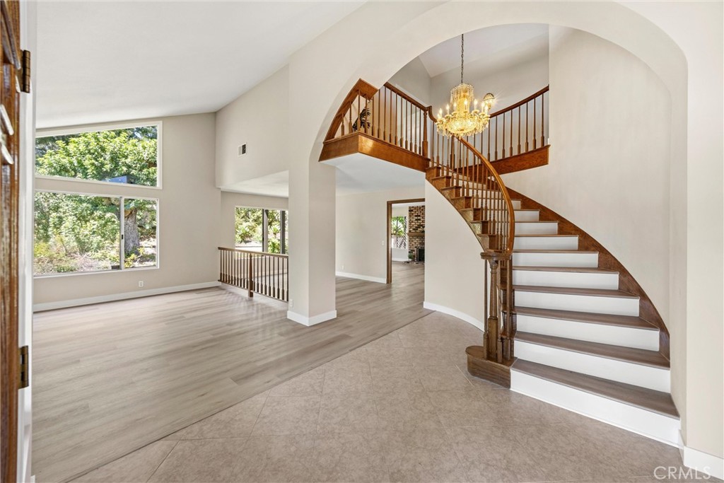 Beautifully refreshed 4-bedroom, 3-bath home on a spacious half-acre lot with stunning San Gabriel Mountain views. Freshly painted and featuring new luxury vinyl flooring throughout, this home offers a bright, inviting floor plan designed for comfortable living and entertaining. Double-door entry opens to a sun-filled living room with fireplace and adjoining dining area. The spacious kitchen is appointed with stainless steel appliances, dual ovens, tile countertops, and ample prep space, and opens to a warm family room with a charming brick fireplace. A large first-floor bedroom, currently used as an office, adds flexibility. Upstairs features a generous bonus room, 3 additional bedrooms, and 2 baths, including a spacious primary suite with a private view deck and a spa-inspired bath with soaking tub, separate shower, vanity, and dual closets. The huge backyard is ideal for entertaining with an expansive patio, sparkling pool, and spa. Additional amenities include an oversized 3-car garage and ample driveway parking. Conveniently located near freeways, shopping, Victoria Gardens, dining, parks, hiking, skiing, and top-rated schools.