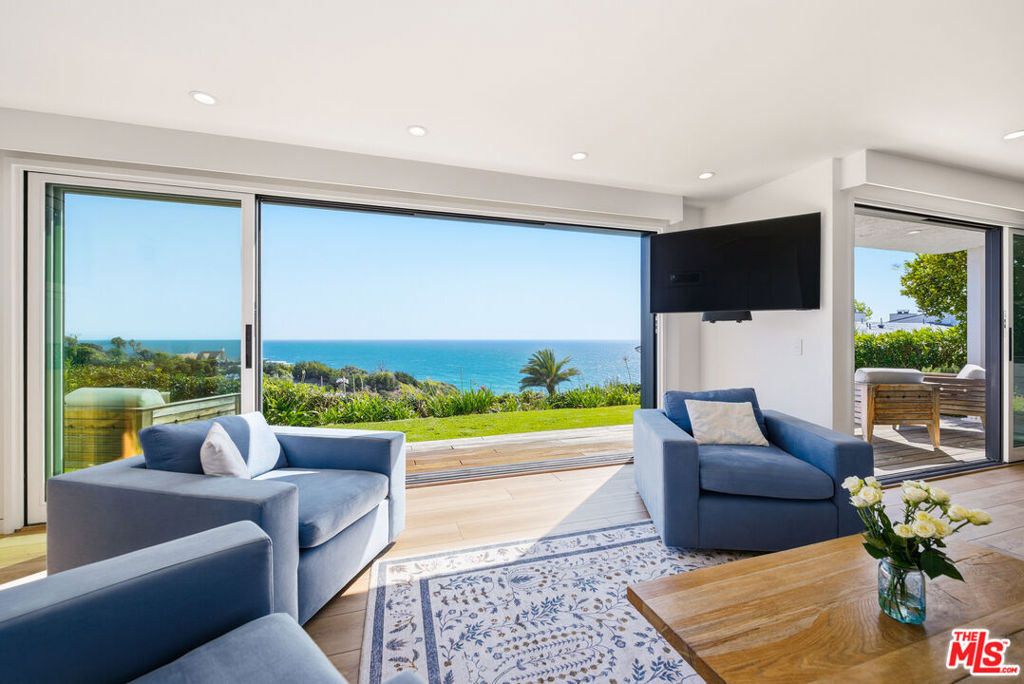Sensational bluff top townhome with totally unobstructed white water ocean views. Located in the guard gated and secure Zuma Bay Villas directly above sandy Westward Beach, this one of a kind end unit is privately located on a very quiet cul-de-sac street. It has been completely renovated and comes fully furnished. The unit features a custom-built floor plan with three spacious bedroom suites upstairs, two with direct, head-on white-water views. Downstairs is a spotless gourmet chef’s kitchen with Blue Bahia granite stone counter-tops and stainless-steel Bosch, Subzero and Miele appliances. The kitchen is open to an adjoining living room complete with Restoration Hardware furnishings (included in the sale), and tall glass sliders opening out to a long teakwood deck and green garden area – perfect for relaxing. To make life at the beach even sweeter, the unit comes with Smart Home features including EMTEK keyless entry, Ring security, Lutron lighting and motorized shade controls, and a Sonos sound system. Plus, there are new water heating and air conditioning systems, ceiling fans, and a clean two car garage. In addition, the complex provides 24 hour security, a heated swimming pool and spa, north/south facing tennis courts, and private steps down to the beach below. Home is everything so grab your surfboards, and your bicycles, and come home to the perfect Malibu beach retreat!