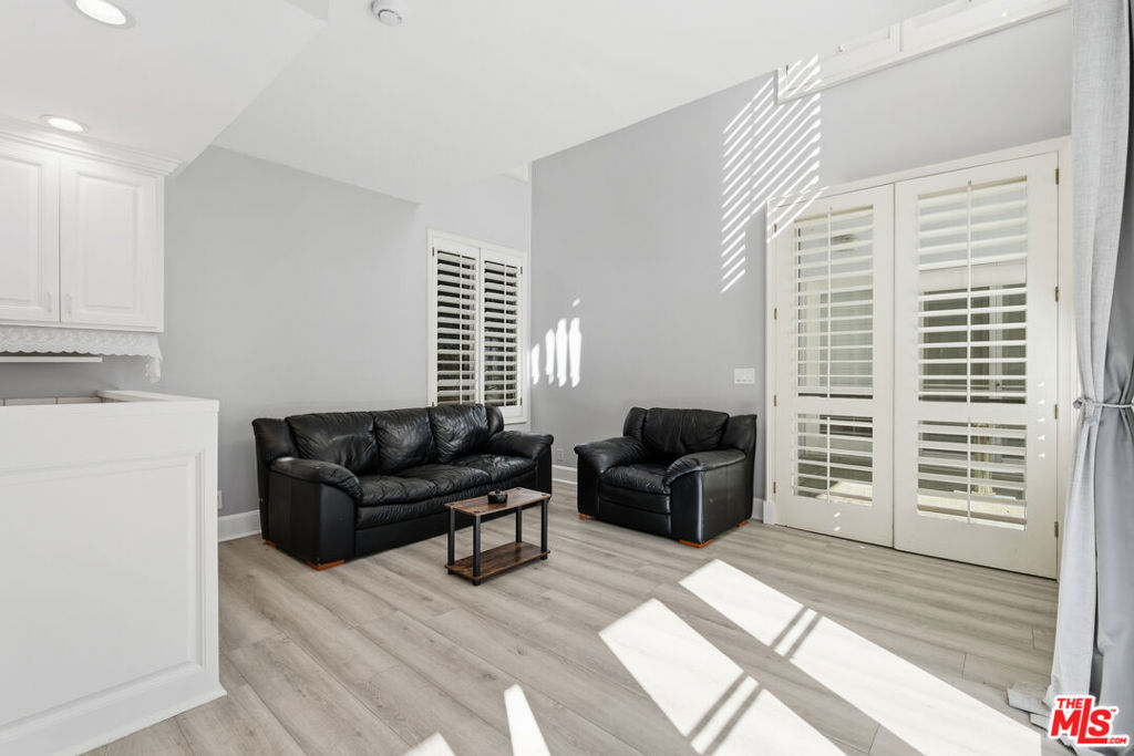 Exceptional two-story Beverly Hills Flats guest house offering bright, inviting living spaces and excellent privacy. The main level features an open living area with abundant natural light, recessed lighting, and wood-style flooring, along with a convenient kitchenette and full bathroom. The upper level includes a spacious bedroom with vaulted ceilings, a skylight, and French doors leading to a private balcony overlooking mature landscaping. Outdoor amenities include multiple seating areas and a well-maintained patio. Designed for comfort and seamless indoor-outdoor living, this residence is ideal for relaxation, extended stays, or guest accommodations.