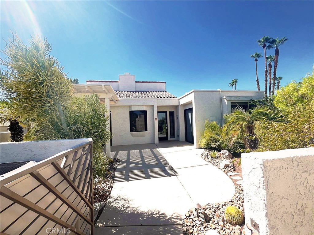 Quietly tucked away on a cul-de-sac within Mission Hills Country Club, this two bed/two full bath condo offers an abundance of upgrades. A private luxury getaway with peek-a-boo mountain views and uninterrupted vistas of the famed Dinah Shore course. Inside the gated front courtyard enjoy a professionally landscaped desert oasis. The interior features updated wood-look ceramic flooring and high-gloss 6” real wood trim. A newly remodeled open kitchen with stunning quartz countertops and modern tile backsplash, new double sink with touch on/off faucet, dimmable LED lighting, plus a 42” sub-zero paneled refrigerator, Dacor gas cooktop and new Samsung Flex Duo oven – its two separate ovens in one. Living room has a matching wet bar area with sink and mini fridge. A slider opens off the dining area to the courtyard for morning coffee. New Hunter Douglas smart powered designer roller shades in main living, dining and kitchen areas and blackout shades in bedrooms. Thoughtful upgrades and contemporary finishes can be found throughout. Generous master suite has amazing views and a spa bath featuring custom dual marble-top vanities (extra tall for the Gents) and a large tub/shower. Guest bedroom and bath have consistent highly upgraded finishes, lighting and closet organizers. A large, fenced rear patio offers late afternoon shade and plenty of entertaining space along with fabulous views of hole #11, all safely outside the range of an errant golfer. For energy savings year round, the unit has a new Lennox 28 SEER HVAC system. The most energy efficient AC unit available anywhere. Large two car + golf cart garage has built-in storage. Community pool and spa nearby. No steps or stairs. Updated 2121 land lease is paid. HOA road resurfaced in fall of 2024. Near shopping (6 minutes to Costco), dining, Eisenhower Hospital & the new Disney Cotino development. Mission Hills Country Club offers three championship golf courses, expansive clubhouse, restaurants, fitness center, tennis, pickleball, croquet and bocci. Membership required. Furnishings are available.