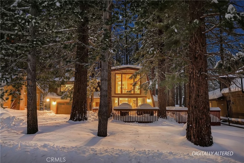 Walk to Snow Summit from this fantastic Modified A-Frame home ~ Inside you are greeted by a soaring tongue and groove ceiling in the living room with a native stone wood burning fireplace ~ Wood grain laminate flooring runs throughout the home except in the bedrooms where you have comfy carpet ~ The main level consists of the living room with a large dining area, the kitchen with granite counter tops and plenty of cabinets, storage areas, and a full bathroom ~ Through the kitchen you cross the indoor laundry area into the attached 2 car garage ~ Currently the garage is being used as a large game room with a built in bar ~ Upstairs you have a large loft with a closet that overlooks the living room and could be used as your 3rd bedroom ~ Through the loft there is a bonus sleeping nook with a bunkbed set up ~ This is where you find the second full bathroom with dual sinks ~ You have both bedrooms upstairs as well with the West facing bedroom having its own balcony deck that gives access down to the yard ~ Out back you have your above ground hot tub, ideal for unwinding after a long day on the slopes ~ The large paver driveway has room for 6 plus vehicles, boat or RV parking ~ Imagine not having to worry about parking for the slopes, being able to walk home for a lunch break and then a five minute walk back to the mountain for afternoon fun ~ Whether you are a winter sports family or summertime outdoor enthusiasts, this is a prime location with room for all your loved ones to spend quality time together under one roof!