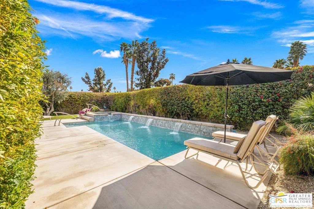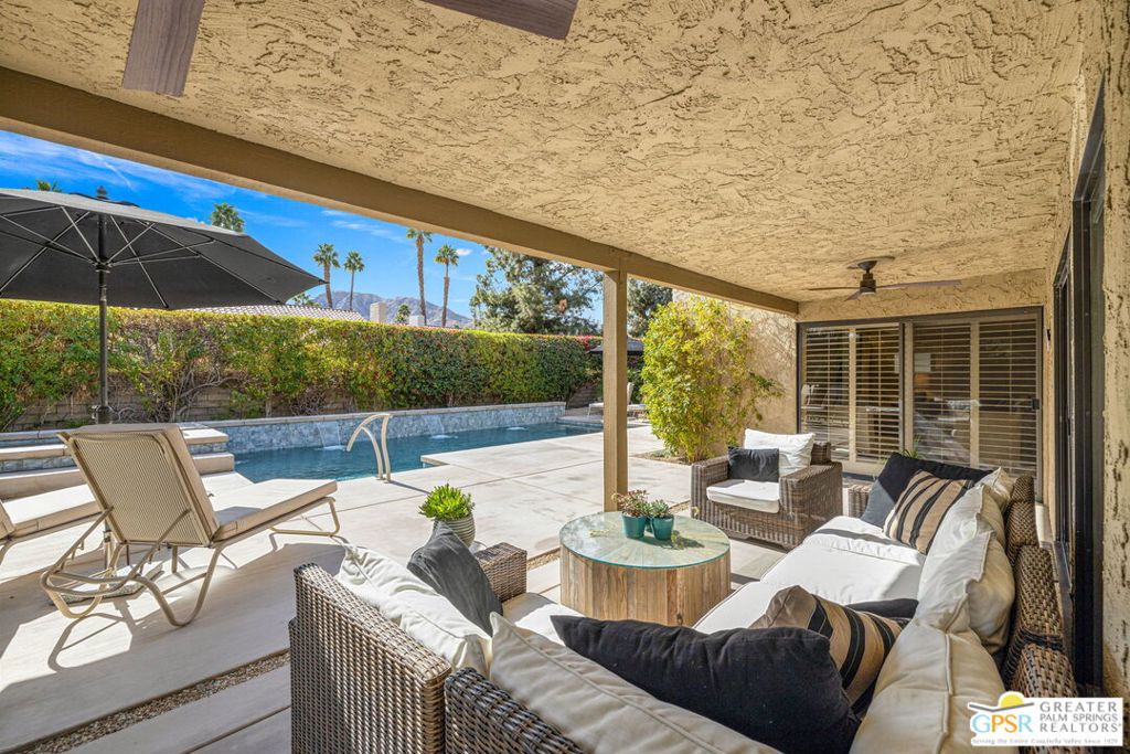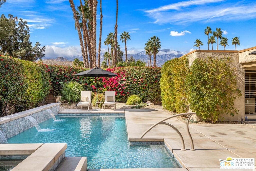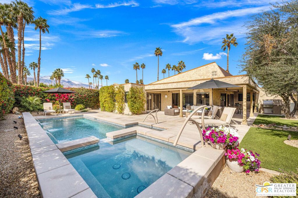 WEXLER STYLE at Rancho Mirage! Motor over to Rancho Estates, a collection of 28 detached homes designed by modernist architect Donald Wexler. This is the ONE TO SEE! An extensive remodel plus system updates and outdoor improvements have taken things to a new level over the past few years. Pool + spa added in 2022 by Premier Pools. Rooftop SOLAR is owned. This ultra-private backyard with its landscape, hardscape, and irrigation additions is a delight on all fronts and sunsets are hard to beat! Covered patios running two sides of the home play beautifully and mountain VIEWS work their MAGIC. Heading inside, tall ceilings, clean lines, and lots of natural light are themes. Check out the fireplace taking center stage where living and dining rooms meet-up. Stylish design choices in the kitchen are seemingly ripped from the pages of Elle Decor. There’s counter seating and adjacent laundry too. Direct patio access is steps away with a built-in barbecue. Take the Matterport VIRTUAL TOUR for a better sense of flow both inside and out. Next up: three spacious bedrooms with nice separation between them. The Ensuite Primary with patio access features a large updated bath with wonderful natural light, dual vanities, and walk-in closet. Vaulted ceilings continue into Guest Bedroom #2 with its updated ensuite bath. Guest Bedroom #3 is adjacent to a full bath, updated as well. A relatively low HOA fee covers front yard landscape maintenance, 2 tennis courts, community gate, and nearby pool. The best of Rancho Mirage and Greater Palm Springs are a short hop away. Enjoy it all!