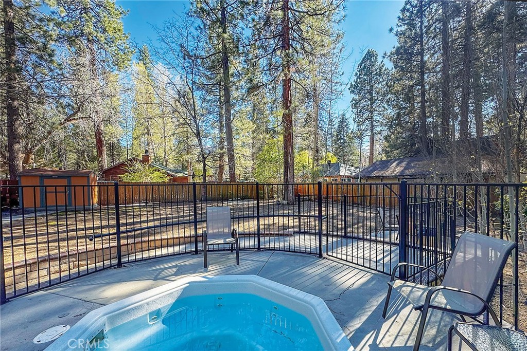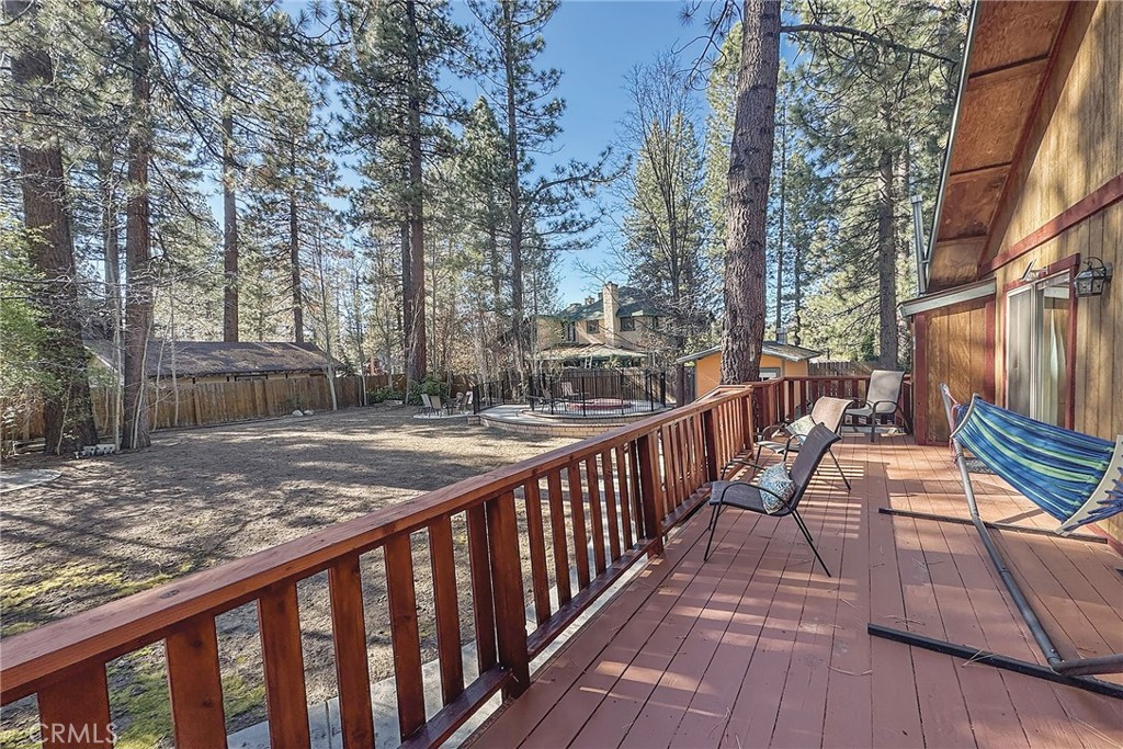This inviting 1,360 sq ft single-story Big Bear Lake home sets the stage for days that begin with adventure & end with connection—“Lake Time,” first tracks on the slopes, & evenings that draw everyone back together. Set on an expansive 11,000+ sq ft, 150′ deep llot, thfe hard-to-find fenced backyard offers space to spread out & enjoy being together, from kids & dogs playing to a fun game of horseshoes or soaking in the spa under Big Bear’s spectacular, star-filled night skies. The front deck welcomes you, while the rear deck extends the living space outdoors, creating moments to gather, relax & take in the setting. Inside, everything comes together in the bright, flowing Great Room—the kitchen becomes the hub for cooking & catching up, people gathering at the dining bar as memorable meals are created, with fireside conversation, movies, & board games all part of one shared space. The kitchen features stainless appliances, granite counters, an expansive dining bar, & a pantry cabinet. Anchoring the space is the stacked-stone fireplace with a wood/stove insert—so inviting on snowy evenings. The bedrooms offer comfortable spaces to step away & recharge, while one room adds a playful touch with bunk beds & trundle—perfect for sleepovers, extra guests, or fun, memory-filled Big Bear nights. The primary suite offers dual sinks, a tub/shower combo with glass doors, & direct access to the rear deck & yard, creating a natural indoor-outdoor connection. Both bathrooms feature tub/shower combos, tumbled travertine vanity tops, & recent updates include fresh interior paint & newly stained decking. Dual-pane windows, central heat, & the laundry area add to everyday comfort. The lot also offers room to grow, with potential for a future garage and/or ADU. The property has exceptional parking—featuring a rare street-level asphalt platform plus an expansive concrete driveway with pull-through access through a double gate, offering flexibility for multiple vehicles, boat or RV parking, & sunny exposure that helps with snow melt. Located just minutes from Big Bear Lake, the Village with its shops & restaurants, marinas, Alpine Coaster, Snow Summit & Bear Mountain, a nearby day-use park, & National Forest access with the road to the largest lodgepole pine in California just down the street, this home offers a balance of connection & setting all centered around the moments that make time here feel special. Well-suited for full-time living, a mountain escape, or STR potential