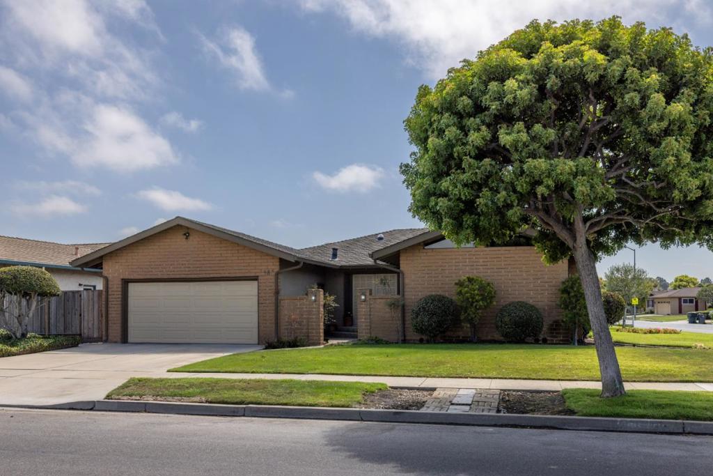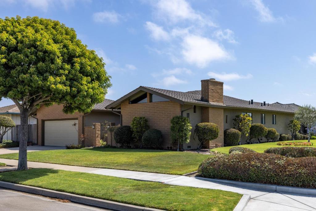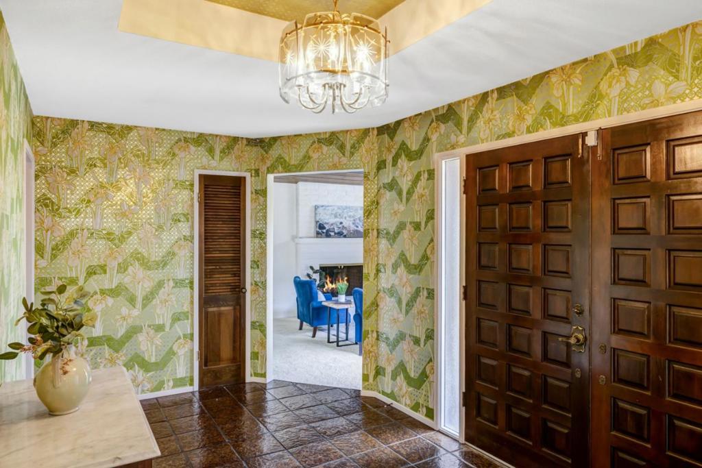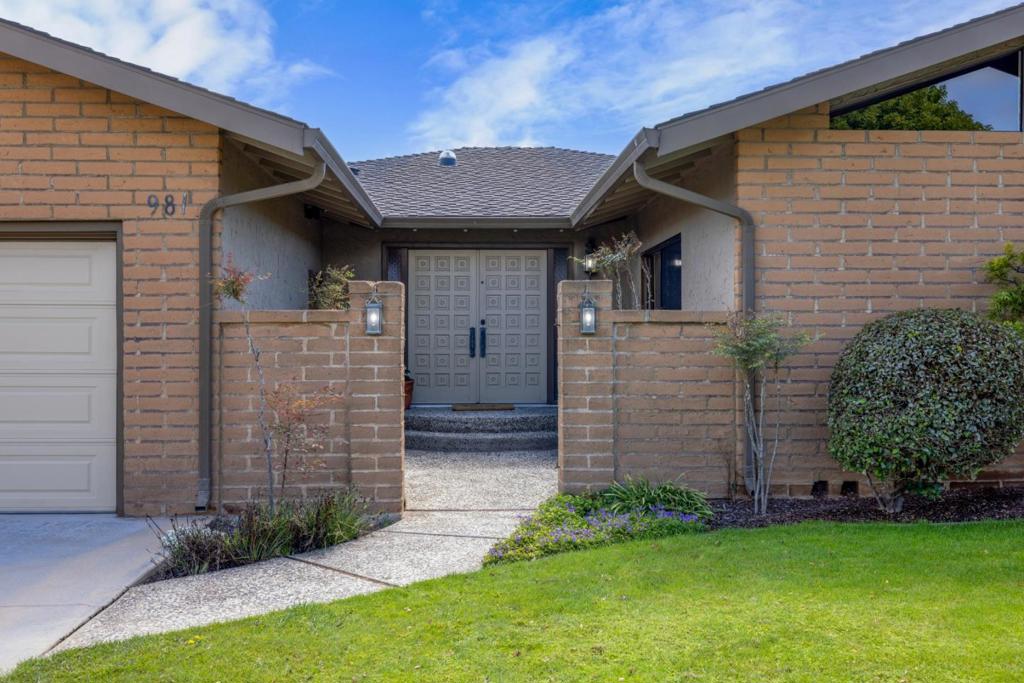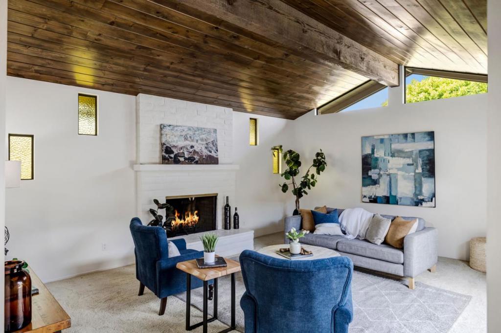 Four textured slit windows filter sunlight through amber-colored glass on either side of a white brick, floor-to-ceiling fireplace, saturating the living room of this traditional Mission Park home with a subtle golden glow. Look up to see pools of refracted yellow light against buttery smooth dark wood ceilings, pitched to lend height to this character-rich room. Indeed, the entire home is a fascinating testament to California’s classic 1970s suburban design ethos, blending clean mid-century lines with warm, Spanish-inspired details. The front entry door, with its sculpted panels and artisan hardware, makes a bold first impression. Step inside into a reception room with striking gilt ceilings and rustic tile floors that mimic the earthiness of natural stone, then find your way to the heart of the home: a spacious kitchen with wood cabinetry and a pass-through window connecting it to a light-filled living area. Imagine your guests filtering in and out of the adjacent formal dining room or grabbing hors d’oeuvres from the breakfast bar before heading out into the backyard. Fully fenced, it features a pebble patio and manicured grassy spaces. There simply aren’t many homes like this left, and this one is looking for a new owner to appreciate its timeless charms and beautiful energy.