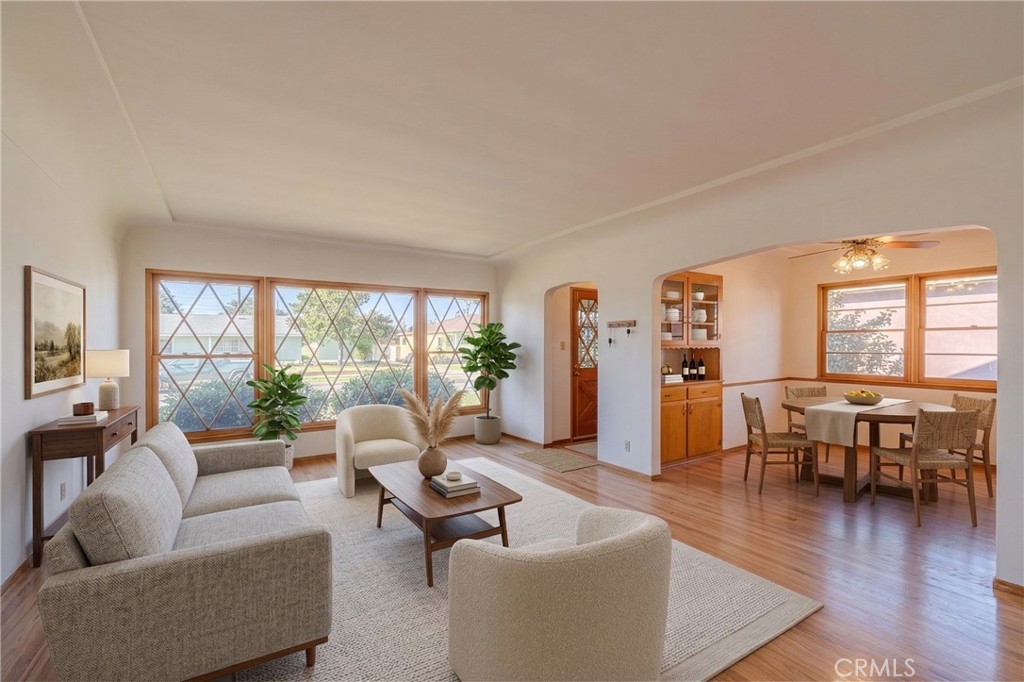 An exciting opportunity in a highly desirable area of Bellflower. This 3 bedroom, 1 and 3/4 bath single family home features wonderful features both indoors and out. Stepping through the formal entry way is the expansive living room with tons of natural light. The living rooms original hardwood floors have been beautifully refinished as were all the hardwood floors throughout the home. Light and bright the home has a fresh coat of paint throughout the property. Looking from the living room you see an inviting formal dining room greeting you under the arched entrance. The dining room has a built in cabinet and connects directly to the kitchen. The kitchen features newer flooring and encompasses another eating area. Connected to the kitchen you are greeted with a large, bright den with a sliding door leading outside. The den itself has a warm fireplace, tall exposed beam vaulted ceilings and new flooring recently installed. This den has an attached 3/4 bath and could suitably function as a 4th bedroom. On the other side of the home are the 3 bedrooms all with hardwood floors, bright windows and all are easily accessible to the full bathroom with retro original style. Stepping out of the den you have a covered deck perfect for enjoying summer days. The driveway that connects from the street all the way to the back of the property is extra long and arrives at the 2 car garage and large parking pad, plenty of room for multiple vehicles. The 2 car attached garage has the washer and dryer hookups. Don’t miss out on this pride of ownership home in a great area of Bellflower.
