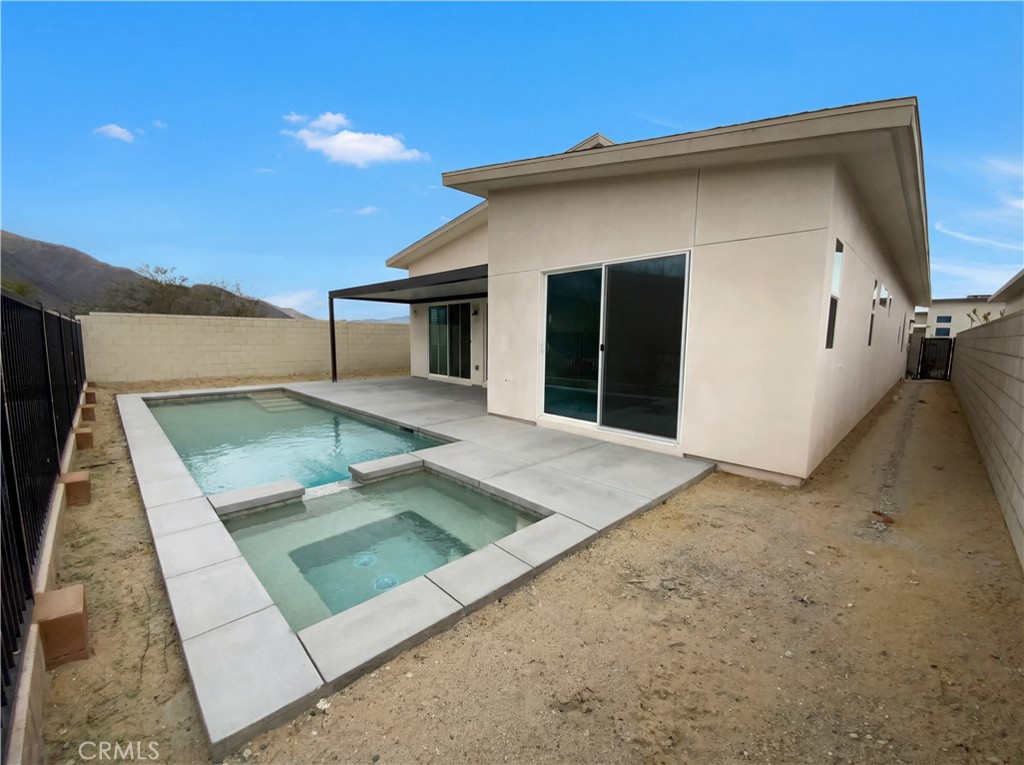 Beautiful single-level home in the Miralon community of Palm Springs, featuring 3 bedrooms and 3.5 baths. The open floor plan centers around the kitchen and great room, with a convenient bedroom and en-suite bath located off the foyer. Two additional bedrooms sit on the opposite side of the home, including a lavish primary suite with a spa-inspired bathroom and a generous walk-in closet. The kitchen shines with quartz counters, stainless appliances, and a large island, perfect for dining and entertaining. Sliding glass doors lead to a covered patio and the spacious backyard, which also showcases a resort-style pool for year-round enjoyment. The Miralon community features fantastic amenities, including multiple pools, a clubhouse, gym, hiking trails, gated access, and more. Residents enjoy easy access to local shopping, dining, and entertainment, making this an ideal desert retreat with all the benefits of a vibrant community. Included 100-Day Home Warranty with buyer activation
