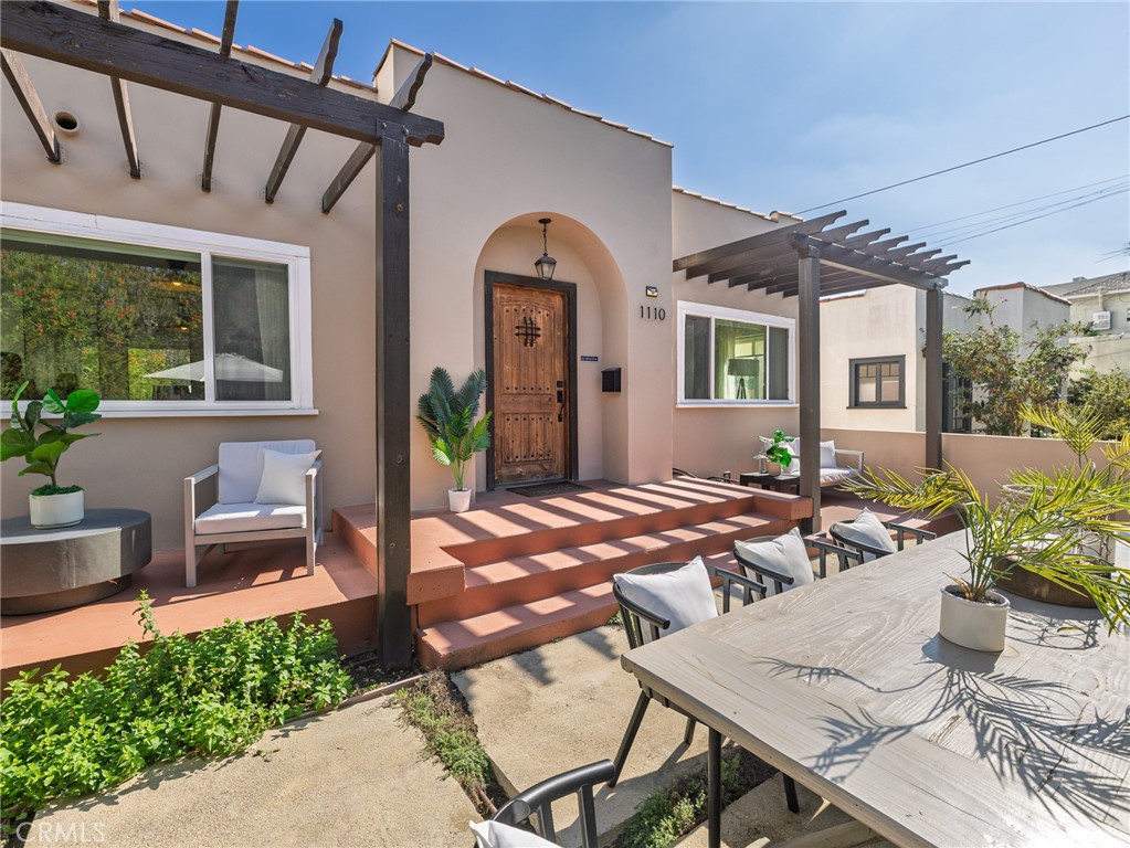 Welcome to 1110 Queen Anne Place, a beautifully reimagined Spanish-inspired residence where timeless character meets the confidence and comfort of modern living. Over a century old, this home proudly preserves its original architectural soul while benefiting from thoughtful upgrades that homeowners value most, from structural reinforcement to energy efficiency and gated security. Set moments from Hancock Park and Larchmont Village, the property is introduced by a lush, low-maintenance front courtyard with dual trellis entry, offering an inviting prelude to the warmth and elegance within. Inside, graceful archways, custom built-ins, and period-appropriate details frame a bright, open floor plan anchored by two distinct living spaces, ideal for both everyday living and entertaining. The updated kitchen blends style and function, featuring a generous Carrara marble breakfast bar, custom cabinetry, an arabesque tile backsplash, and high-end stainless steel appliances. The generous dining space provides ample room to entertain for the holidays or a fun game night. The primary suite serves as a tranquil retreat, complete with a custom walk-in closet, built-in marble desk, and French doors opening to the rear yard. The spa-inspired bathroom features designer tile and a Kohler soaking tub with temperature controls, creating a true at-home sanctuary. A standout feature of the property is the detached two-car garage with a permitted studio above, previously used as a recording space and complete with a half bath. This flexible and private space offers exceptional versatility and is ideal for a creative studio, home office, guest suite, or potential future ADU conversion, buyer to verify. Beyond aesthetics, the home offers meaningful peace of mind with the structure bolted to the foundation, a motorized electric driveway gate, and fully paid-off solar panels that provide long-term energy savings. Drought-tolerant landscaping further enhances ease of ownership and low maintenance living. This is a rare opportunity to own a 100-year-old home that honors its historic charm while delivering the modern conveniences and security expected today, all in a prime central location close to the shopping, dining, and culture of Hancock Park, Larchmont Village, Mid-City, and surrounding neighborhoods.