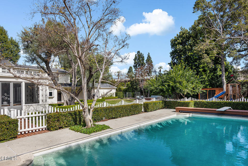 Majestically poised in Pasadena’s sought-after Arroyo neighborhood, the Charles E. Davis House is a distinguished Colonial Revival estate designed by renowned architect Roland E. Coate and carrying the storied provenance of a past family connection to famed chef Julia Child through her father, John McWilliams, the home’s second owner. Thoughtfully remodeled in 2018 for today’s lifestyle and elevated in 2020 by a stunning guest house, this property sits on three-quarters acre of manicured grounds and marries timeless architectural pedigree with an effortless indoor-outdoor lifestyle. The stately facade reveals Coate’s hallmark of grand proportions and livable elegance. A formal entry beckons guests into a gracious living room, a handsome library, an inviting dining room, balanced by a comfortable family room with movie projector and screen, and an adjoining sunroom, where boundaries between house and the lush gardens dissolve. At the heart of daily life is a charming chef’s kitchen, breakfast area and back kitchen, while two main-level guest suites, powder rooms and laundry room add welcomed practicality. Gracing the second level, the sumptuous primary suite and four additional BRs capture serene treetop views, served by three beautifully-remodeled bathrooms, laundry room and two staircases, creating restful and private quarters. Outside, the resort-like grounds evoke magic, with numerous entertaining terraces, fire pit, salt-water pool, play area, vegetable garden, chicken coop, music speakers and sweeping lawns that turn gatherings into occasions. The exceptional accessory structure with 18′ glass bifold doors, beamed ceilings, two bathrooms and a bonus room, seamlessly flexes as an entertainment pavilion, creative studio or a stylish place for guests. Gated and private, and with close proximity to Arroyo hiking trails, Old Town shops, restaurants and an easy connection to DTLA and the Westside, this estate truly is a quintessential Pasadena legacy, authentic in character, meticulous in execution and abundantly livable for today’s discerning buyer.