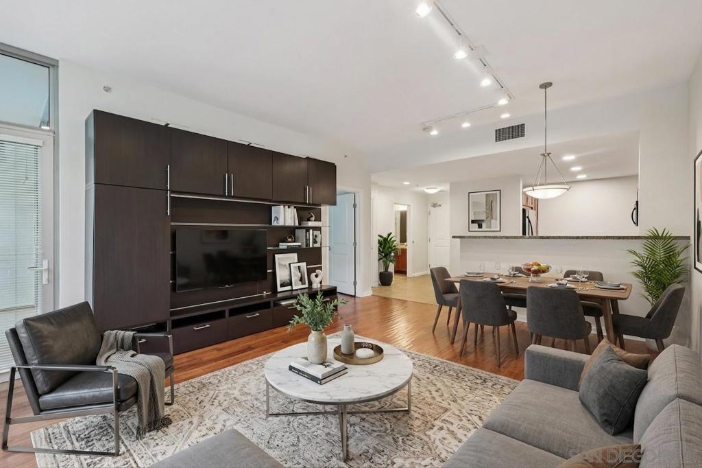 Experience the vibrant energy of East Village in this spacious 1-bedroom, 1-bath residence just steps from Petco Park, top dining, nightlife, and the scenic waterfront. The open living, dining, and kitchen layout is perfect for entertaining, flowing seamlessly to a large covered balcony with tranquil treetop views—ideal for morning coffee or evening unwinding. The chef-inspired kitchen boasts granite counters, abundant cabinetry, breakfast bar seating, and stainless steel appliances. Retreat to the king-sized bedroom, complemented by a roomy bath and excellent storage. Added conveniences include in-unit laundry, and secure parking. Residents enjoy premium amenities such as a BBQ deck, fitness center, and community room. With easy access to the Gaslamp Quarter, Seaport Village, Little Italy, and nearby beaches, plus close proximity to the trolley, train, and airport, this home offers the ultimate in urban living and convenience.
