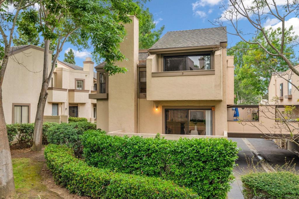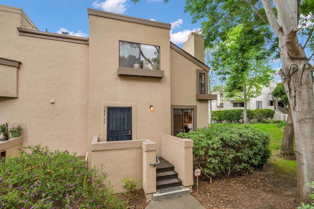 Light & Bright end unit, popular PLAN 5 tucked away in a quiet corner of the complex with a beautiful surrounding greenbelt! Updated gorgeous wood laminate flooring downstairs, and carpet upstairs. Mirrored wardrobe doors, closet organizers, a special alcove off of the primary, for reading, exercising, play area, or a little nursery. A delightfully updated kitchen with quartz counters, wet bar and a wine fridge. The second room has built in shelves, desk and a Murphy bed, and en suite bathroom. Enclosed patio off of main living area, an attached 2.5 car garage, washer & dryer & Guest parking pass. Loads of storage space, upgraded electrical. Community Pool, spa, tennis courts, clubhouse, and greenbelt!