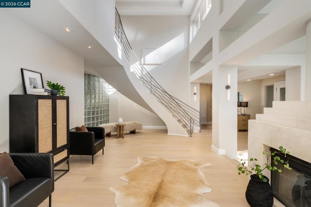 Sophisticated custom contemporary in a prestigious gated Blackhawk community. Privately situated on .40 acres, this architectural showpiece seamlessly blends modern design with effortless indoor-outdoor living. New European French oak floors, dramatic exposed beams, a sculptural floating staircase, floor-to-ceiling windows, and a free-form pool create a striking yet inviting aesthetic. The main level features a grand entry, a spacious formal living room with a stunning two-sided fireplace, a beautifully appointed chef’s kitchen with custom cabinetry, an elliptical island, and stainless steel appliances. The kitchen opens to the family room, complete with a custom theater system, ideal for both everyday living and entertaining. A main-level bedroom, along with 2 full baths, one with direct pool access. Upstairs, primary retreat offers a fireplace & adjacent flex space perfect for an office or private lounge. Two additional bedrooms & a hall bath provide comfortable accommodations for family or guests. Resort-inspired grounds include a pool and spa, outdoor shower, built-in BBQ, putting green, vegetable garden, fruit trees & lush, mature landscaping. Additional features owned solar, a solar-heated pool & spa, new HVAC, home theater, EV charging & finished 3-car garage.